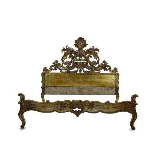 ITALIAN CARVED AND LACCA GILDED DOUBLE BED ORNATE BAROQUE STYLE COMPLETE WITH HEAD FOOT SIDE RAILS BASE BOARD AND MATTRESS 150 CM HIGH 168 CM WIDE 210 CM LONG FOOT BOARD 56 CM HIGH 39 CM HIGH FROM RAILS