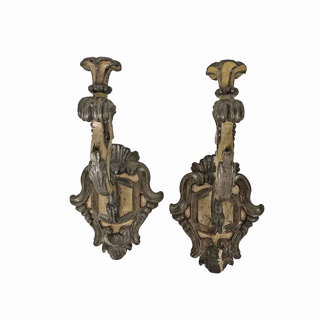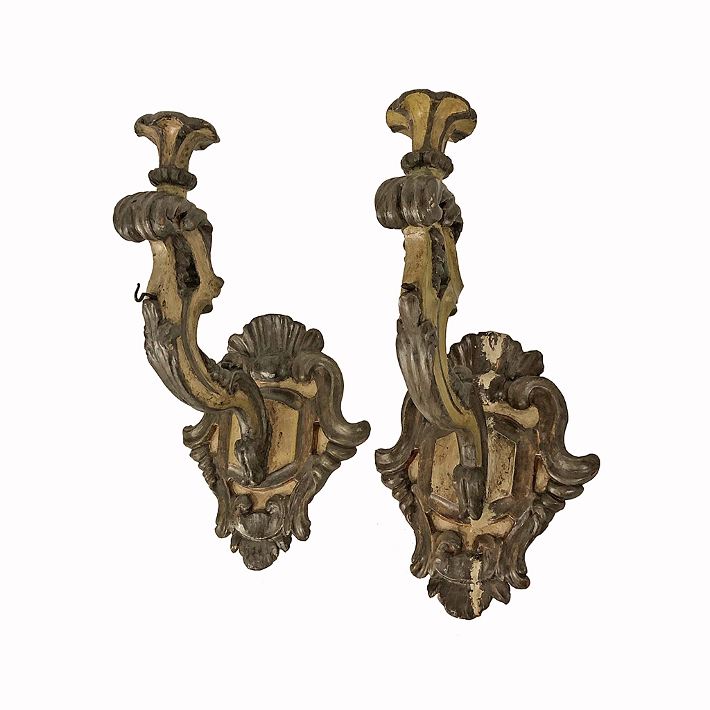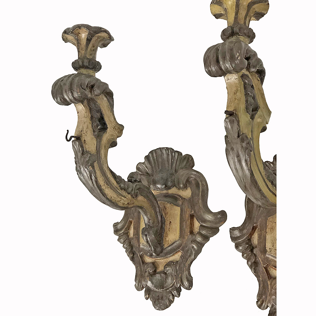 ITALIAN CARVED AND PAINTED WALL SCONCE / WALL LIGHT CREAM AND SILVER GILT WITH CARTOUCHE BACK 71 CM HIGH (X2)