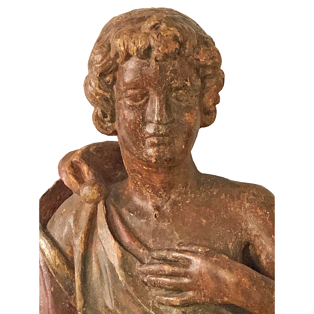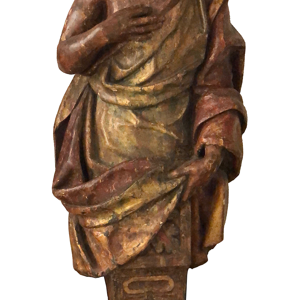 ITALIAN CARVED BAROQUE DRAPED HERM FIGURE POLYCHROME AND GILDED ON OAK HEXAGONAL BASE 17TH CENT 118 CM HIGH 43 CM WIDE 24 CM DEEP (X2)