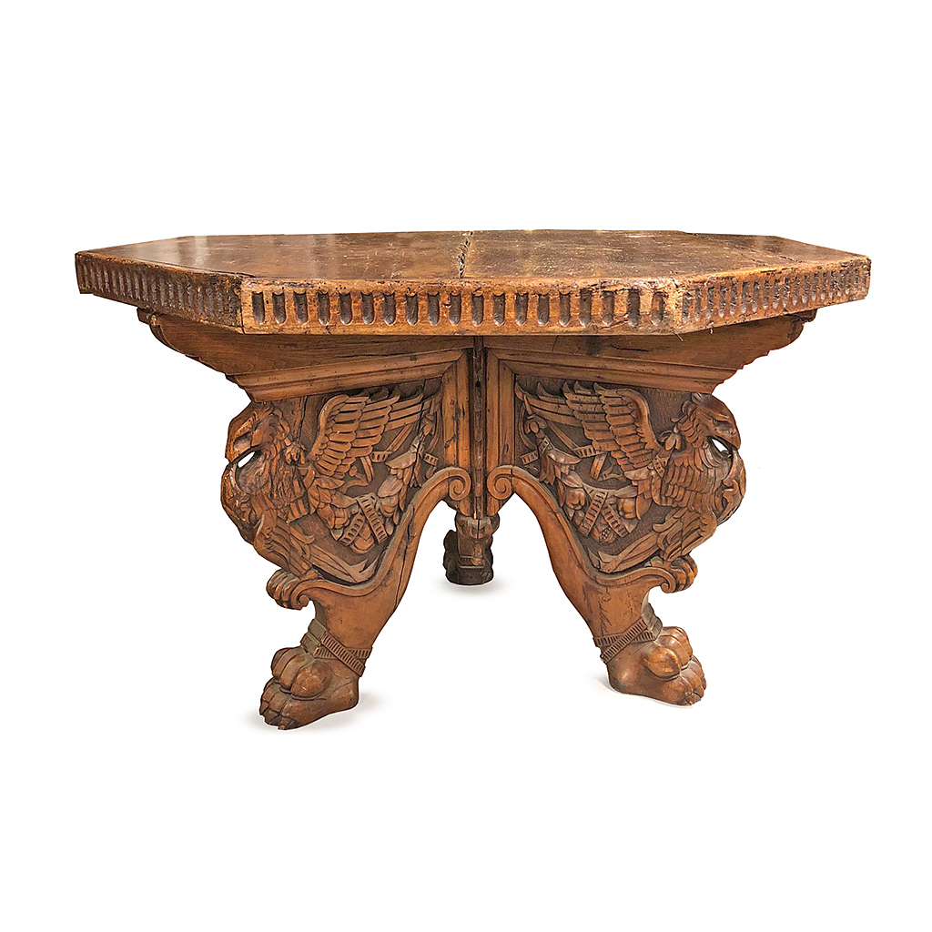 ITALIAN CARVED WALNUT OCTAGONAL CENTRE TABLE WITH EAGLE TRI LEG BASE FLORENTINE 16 TH CENT. 118 CM DIAM 78 CM HIGH