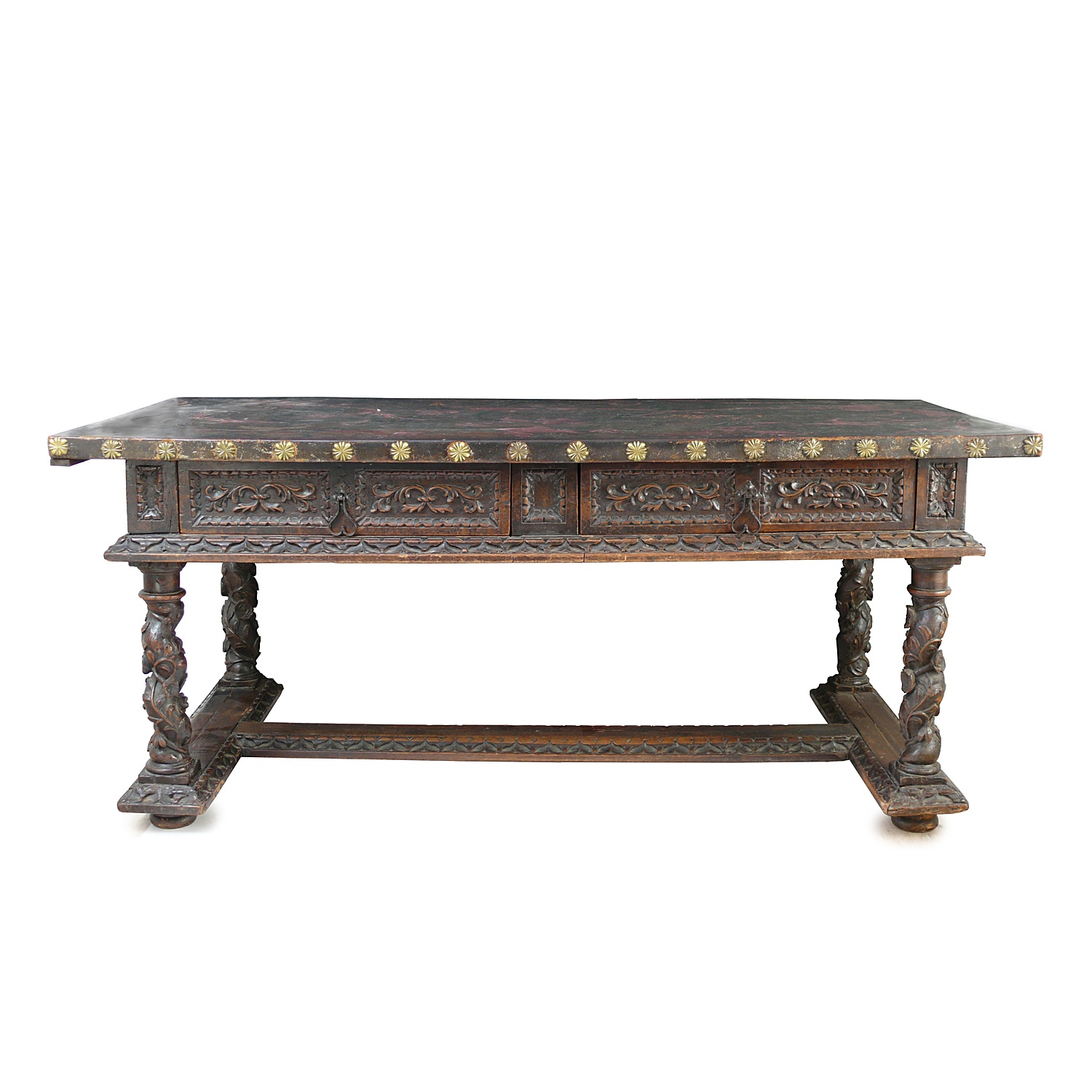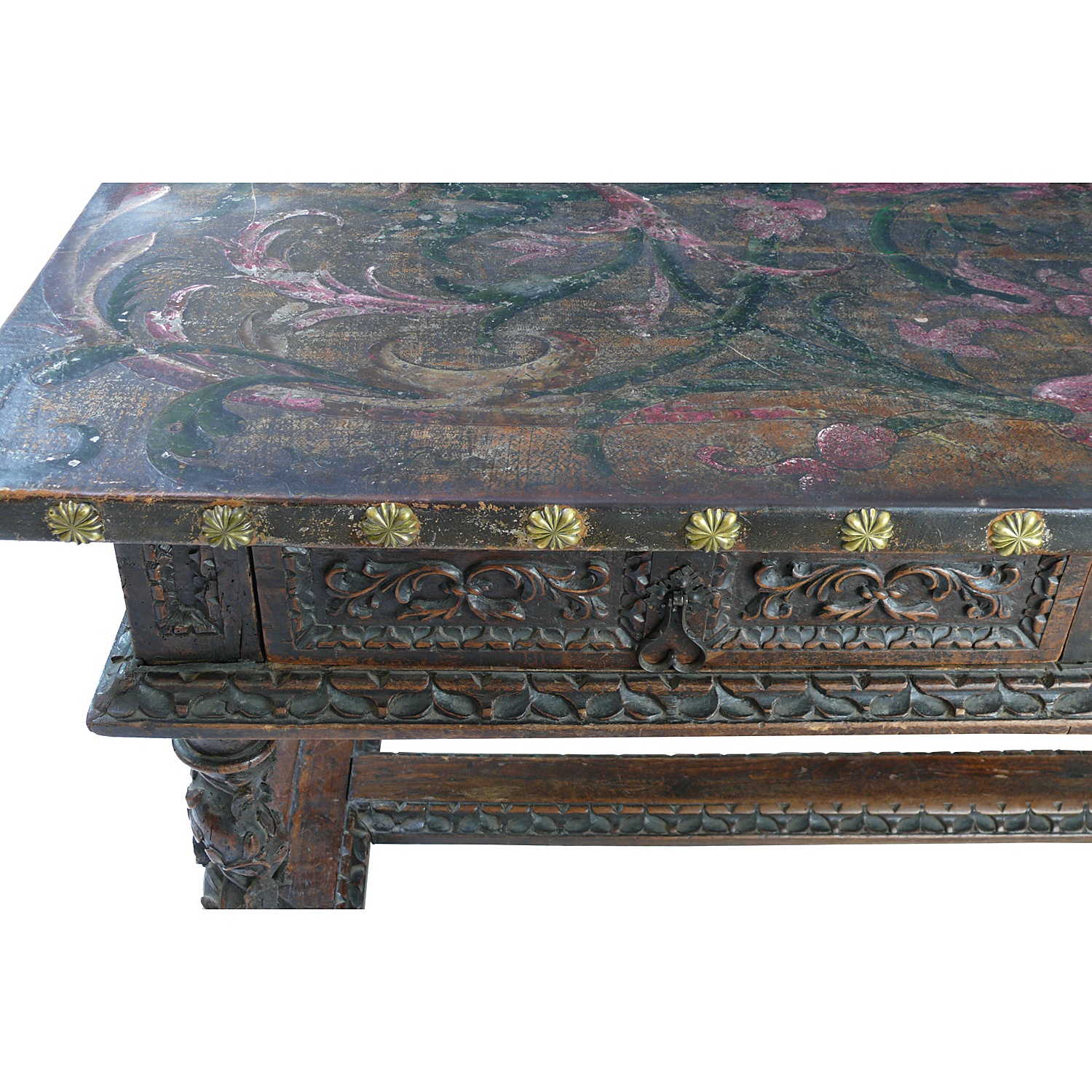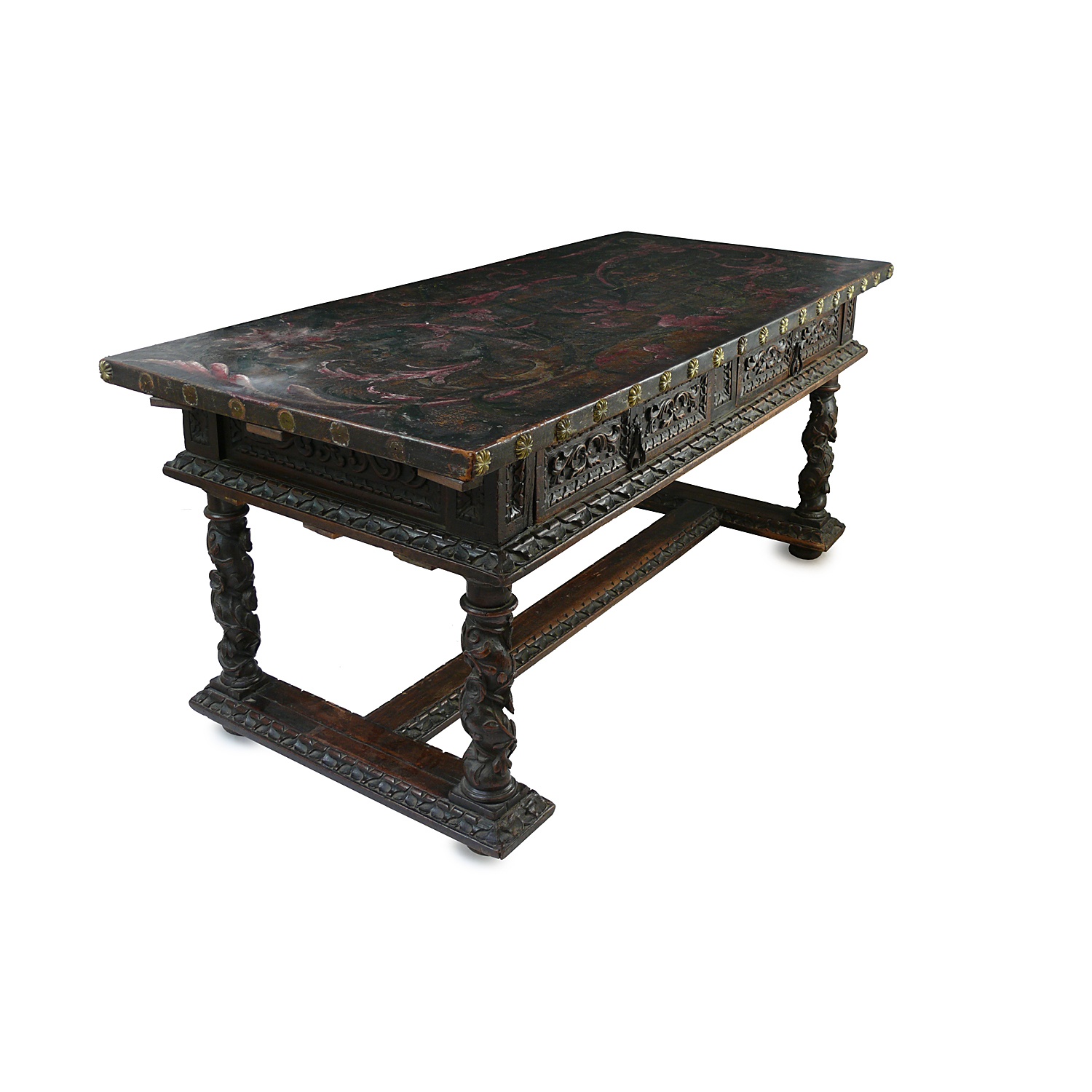 ITALIAN CENTRE TABLE ORNATE CARVED WALNUT WITH TWO DRAWERS AND A FLORAL POLYCHROME PAINTED LEATHER TOP 17TH CENT 78 CM HIGH 181 CM WIDE 80 CM DEEP