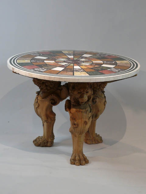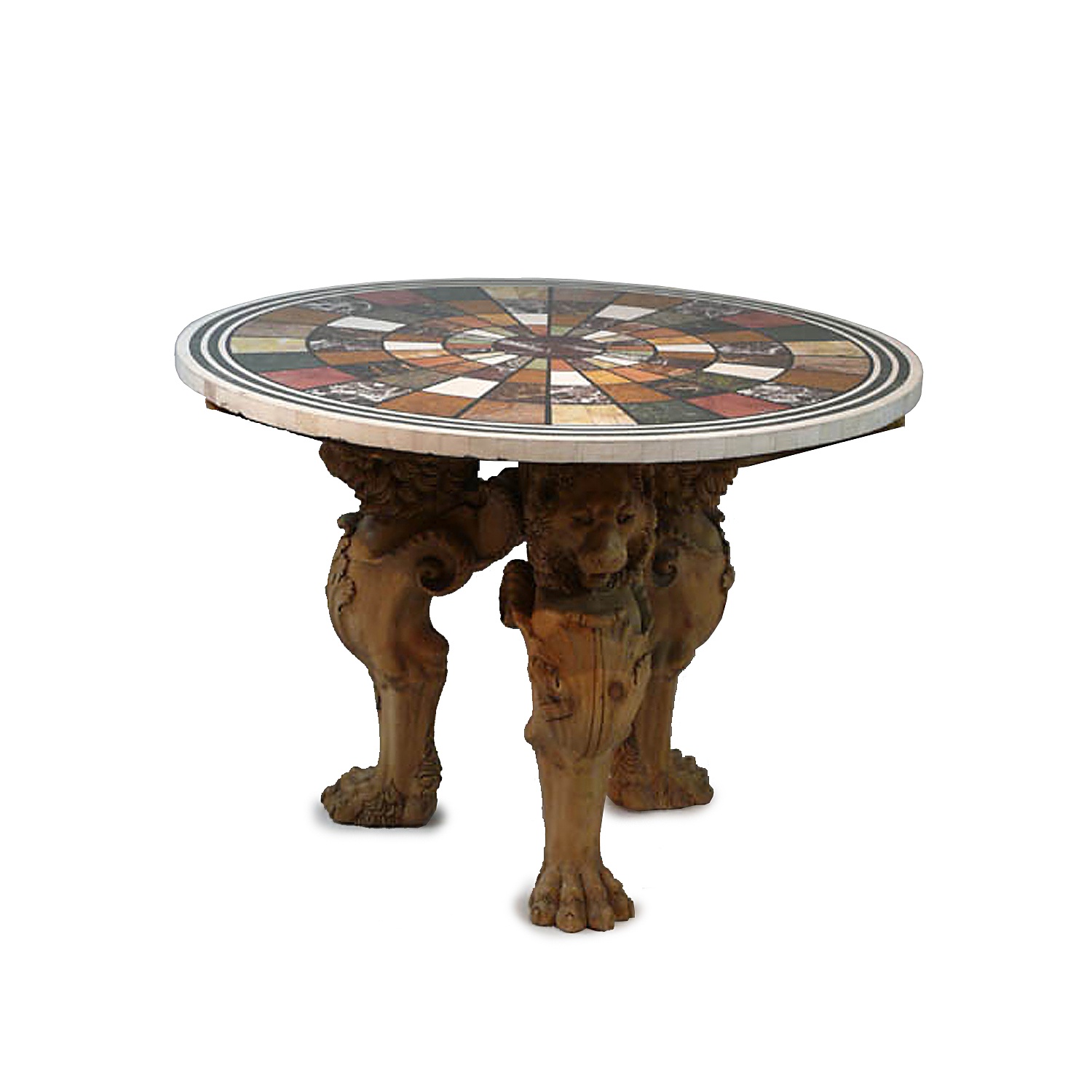 ITALIAN CIRCULAR SPECIMEN MARBLE TABLE WITH CONCENTRIC GRID PATTERN ON CARVED LION BASE 3' 6/i DIAM 107 CM