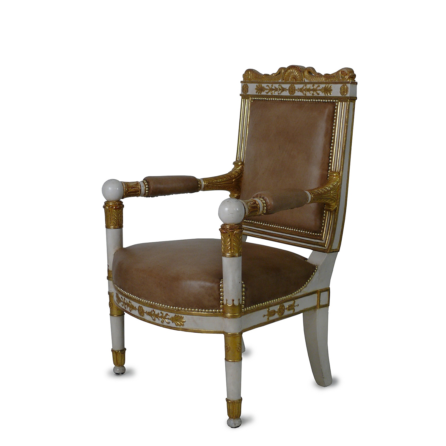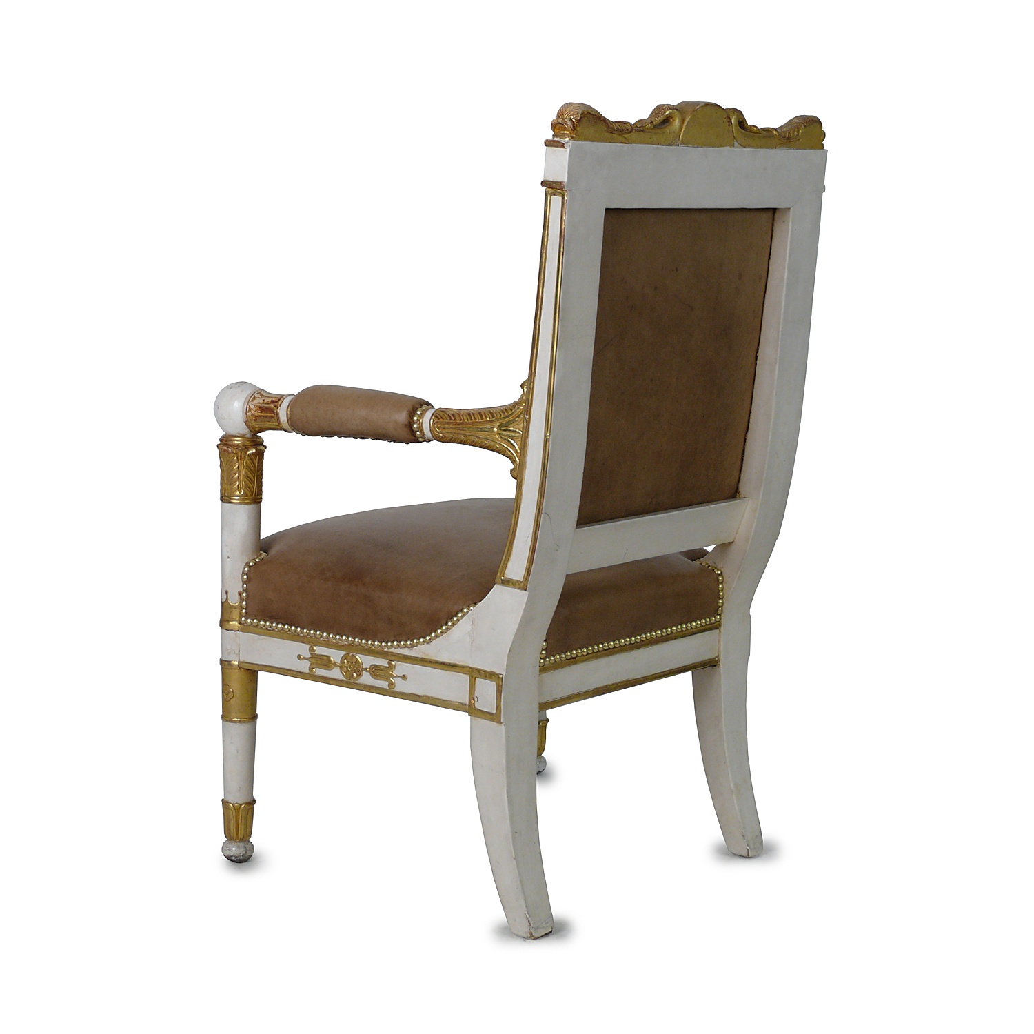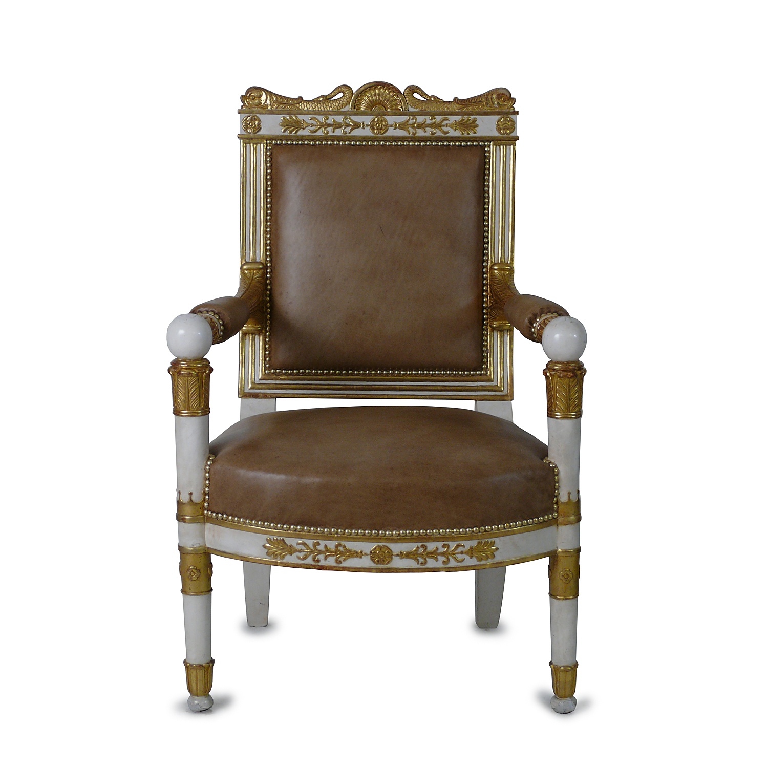 ITALIAN CREAM AND GILT ARM CHAIR EMPIRE STYLE RESTORATION PERIOD EARLY 19TH CENT WITH HAVANA TAN LEATHER UPHOLSTERY 101 CM HIGH 65 CM WIDE 63 CM DEEP
