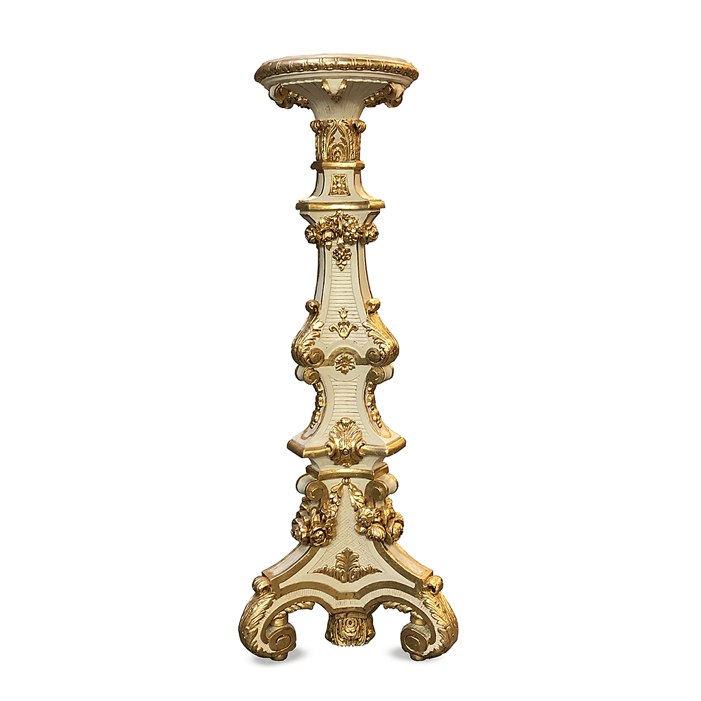 ITALIAN FAUX TORCHER / PEDESTAL TRI LEG BASE 18TH CENT STYLE CREAM AND GILT PAINTED 155 CM HIGH (X23)