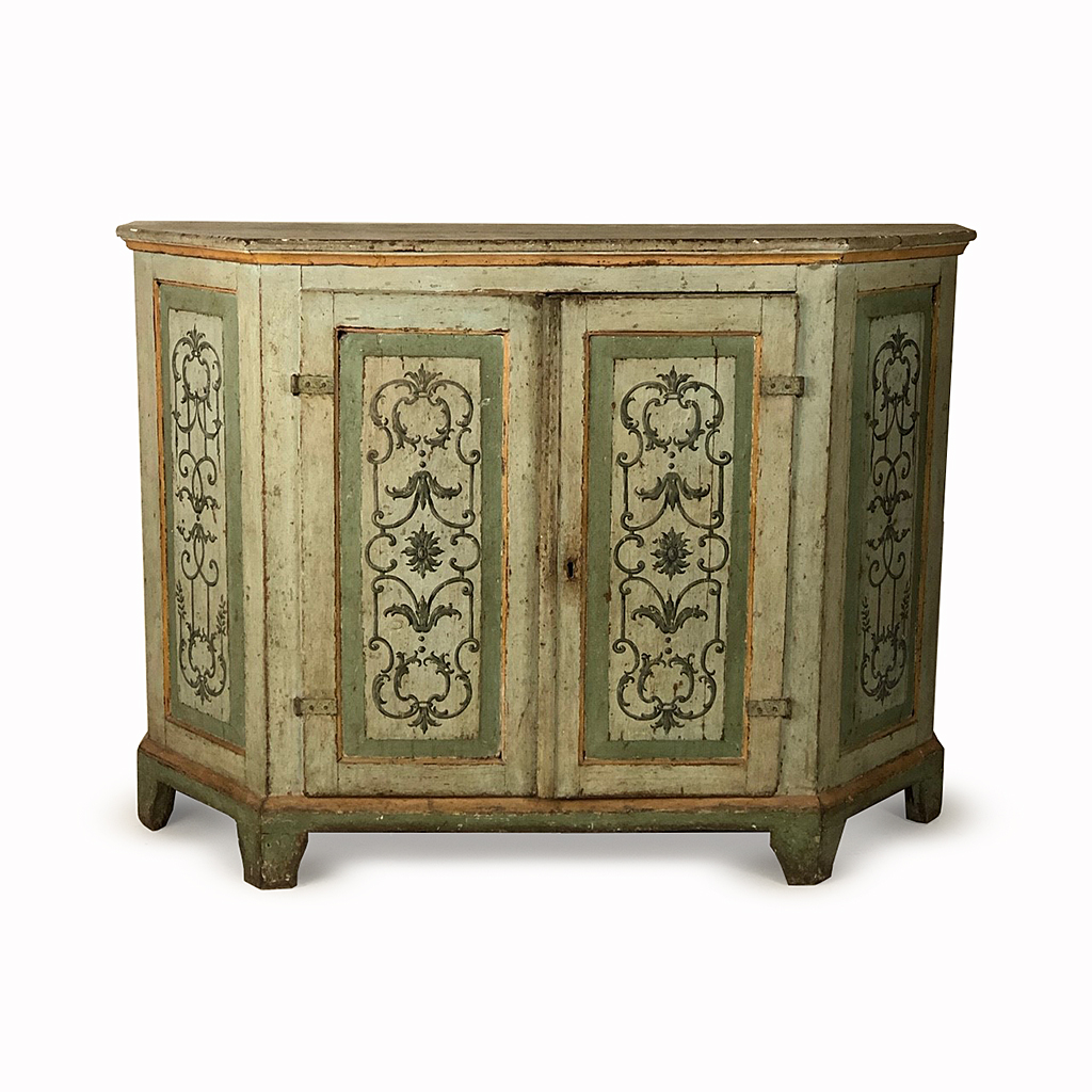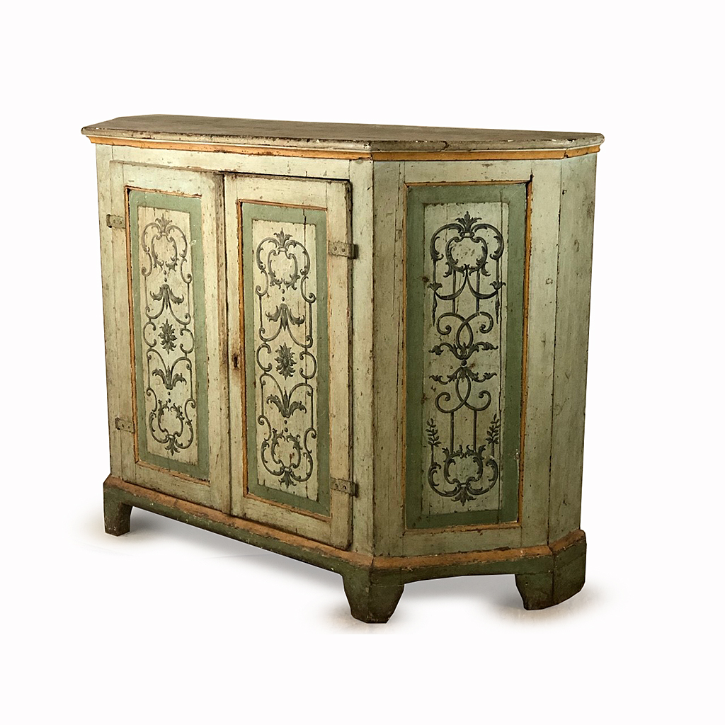 ITALIAN / FLORENTINE PAINTED CUPBOARD PALE GREEN AND CREAM DECORATED DOORS AND RAKED SIDE PANELS 17TH CENT 109 CM HIGH 149 CM WIDE 48 CM DEEP