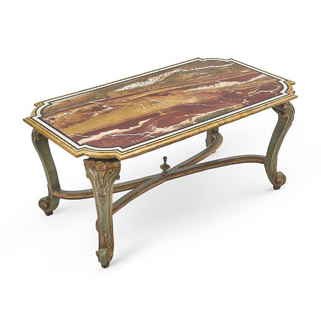 ITALIAN GREEN PAINTED AND PARCEL GILT COFFEE TABLE WITH INLAID MARMO POLICHROMA SICILIAN JASPER MARBLE TOP 49 CM HIGH 109 CM LONG 60 CM WIDE CIRCA 1900