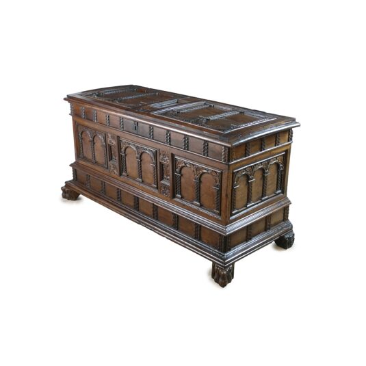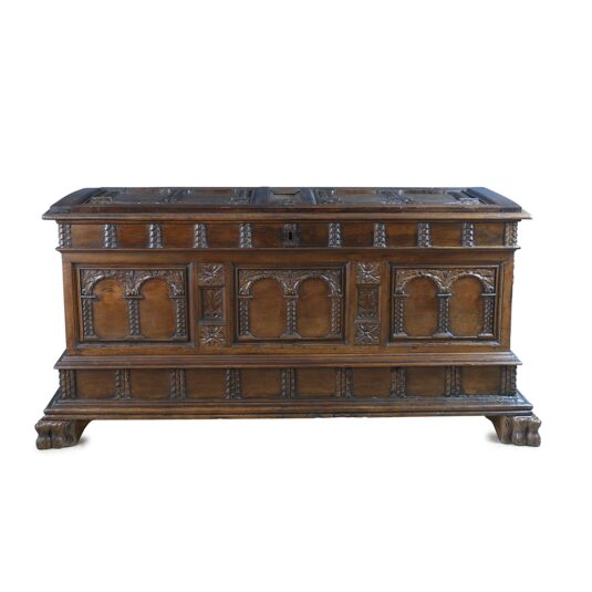 ITALIAN LIGHT WALNUT CASSONE / CHEST THE FRONT WITH THREE PAIRS OF ARCADED PANELS ON LION PAW FEET 17TH CENT 71 CM HIGH 137 CM LONG 52 CM WIDE