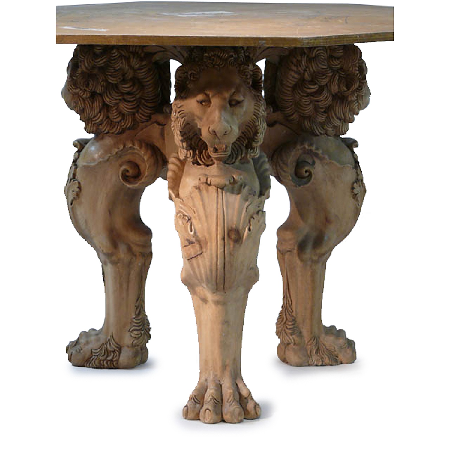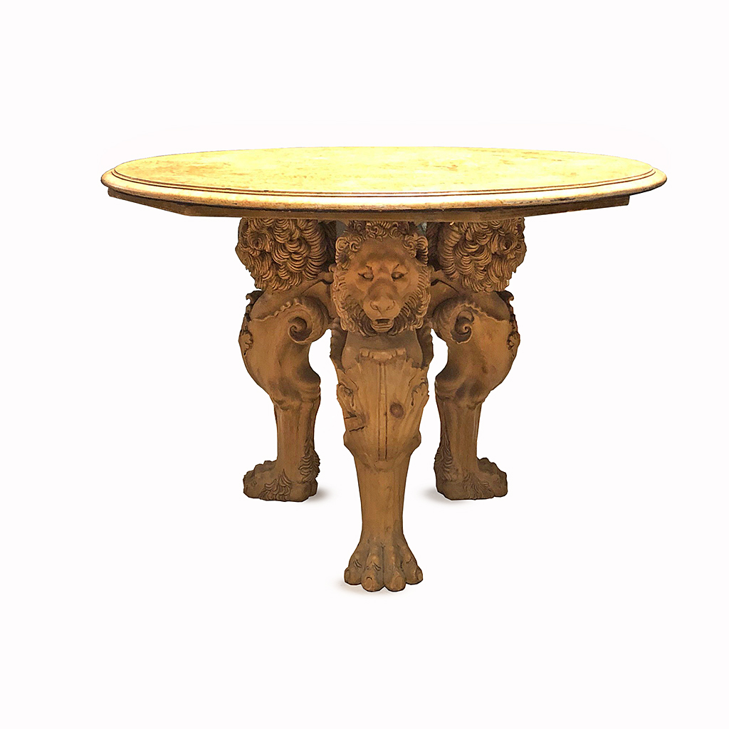 ITALIAN LIGHT WOOD CENTRE TABLE IN THE FORM OF THREE CARVED LION HEADS WITH PAW FEET CIRCULAR FAUX SIENA MARBLE TOP 79 CM HIGH 119 CM DIAM
