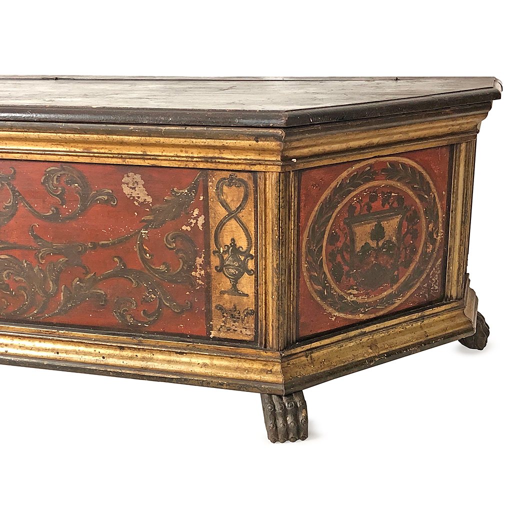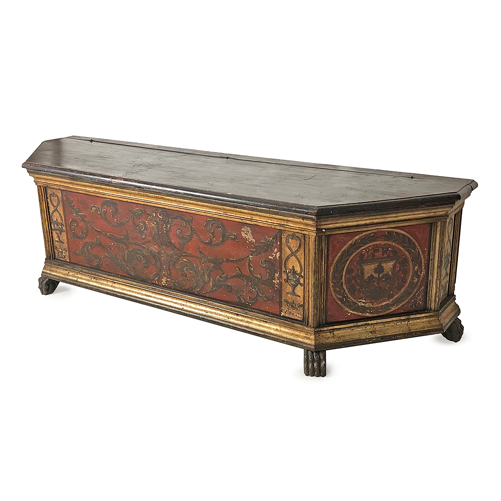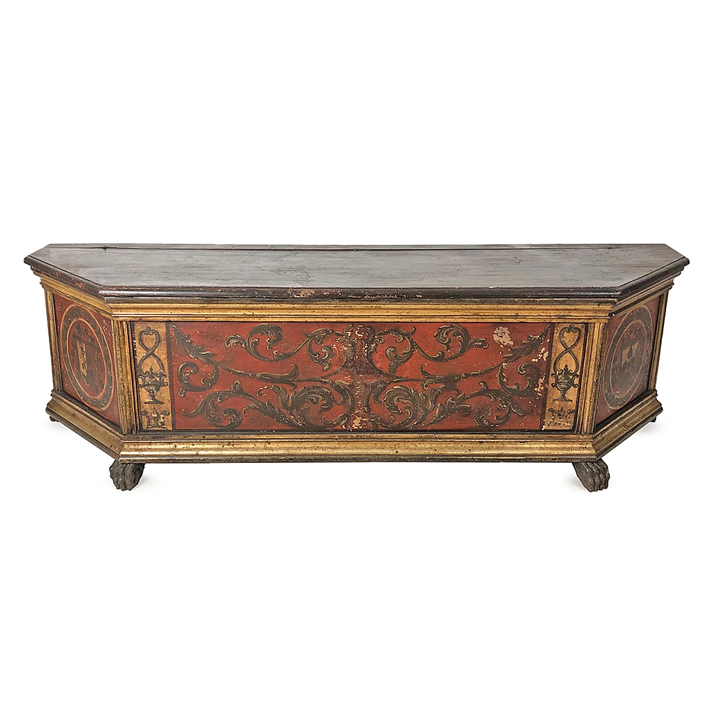 ITALIAN LONG CASSONE / CHEST ORNATE POLYCHROMED FRONT PANELS RED AND GOLD WITH CANTED ENDS ON CARVED PAW FEET SIENA CIRCA 1710 56 CM HIGH 187 CM LONG 53 CM DEEP