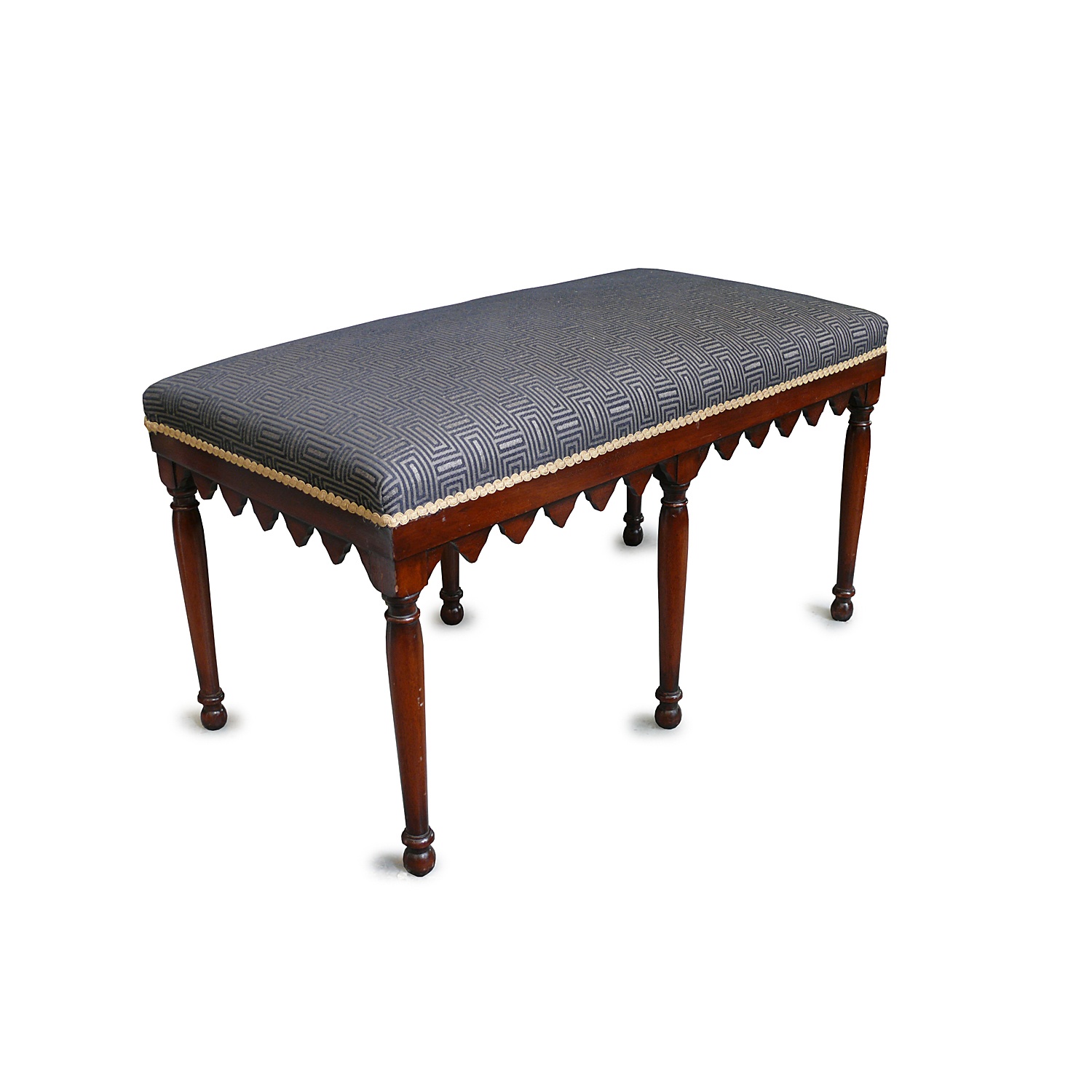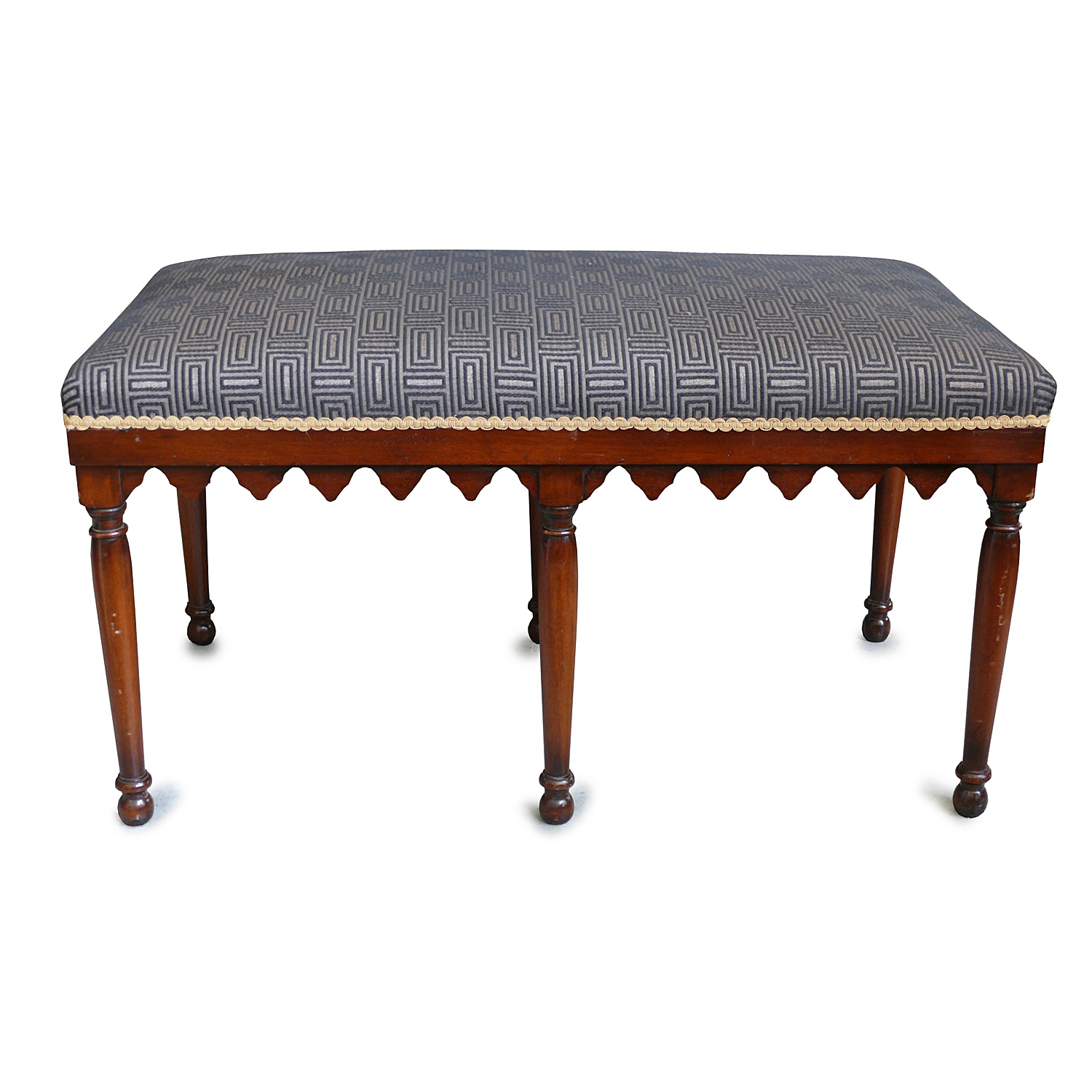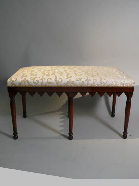 ITALIAN MAHOGANY NEO-GOTHIC SIX LEG STOOL WITH PALLADIAN NAVY PATTERNED UPHOLSTERY AND GOTHIC TRACERY FRIEZE 1'8/i HIGH 3'2/i WIDE 51 CM X 97 CM