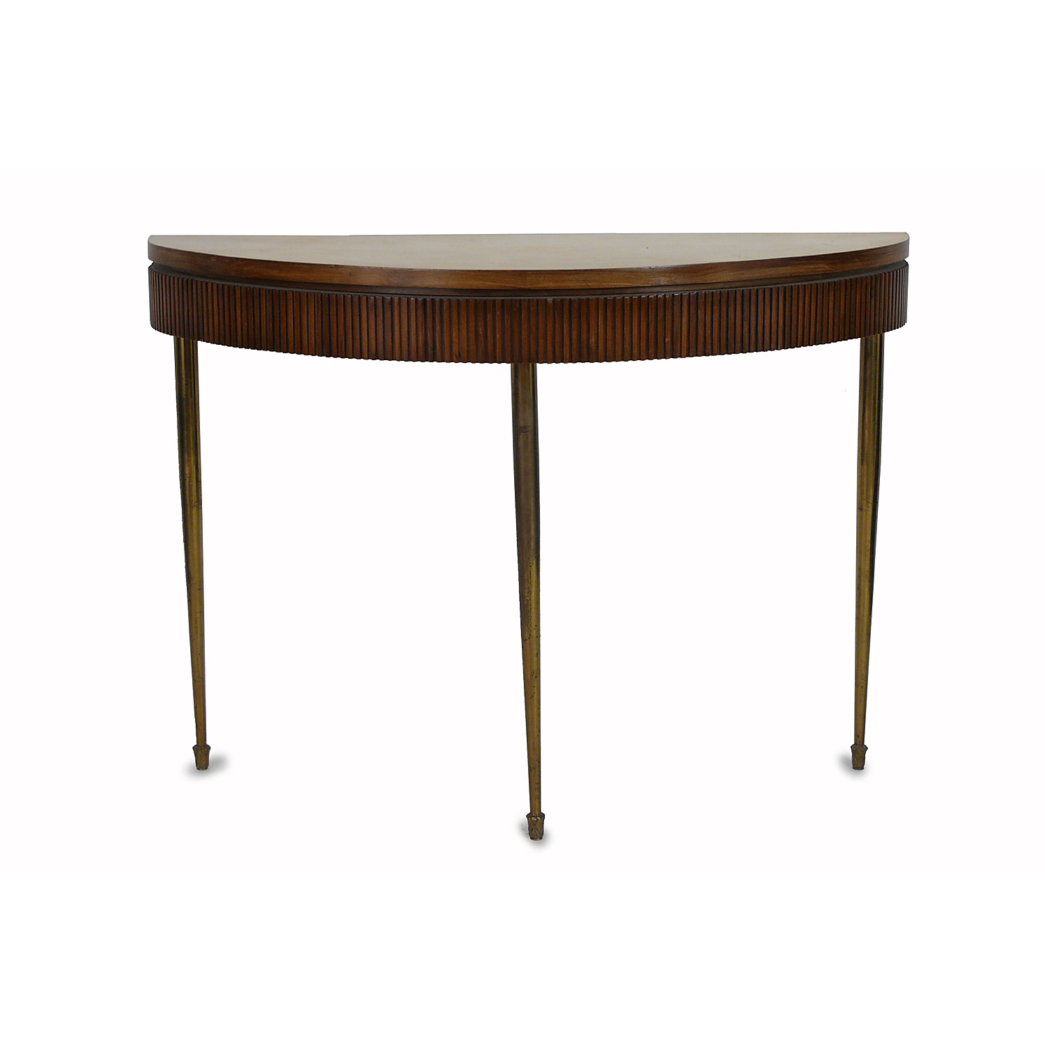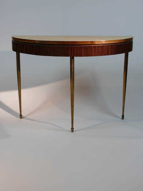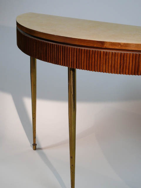 ITALIAN MODERN DEMI LUNE FLUTED WOODEN CONSOLE / SIDE TABLE WITH BRASS LEGS AND CREAM VELLUM TOP CIRCA 1960110 CM LONG (X2)