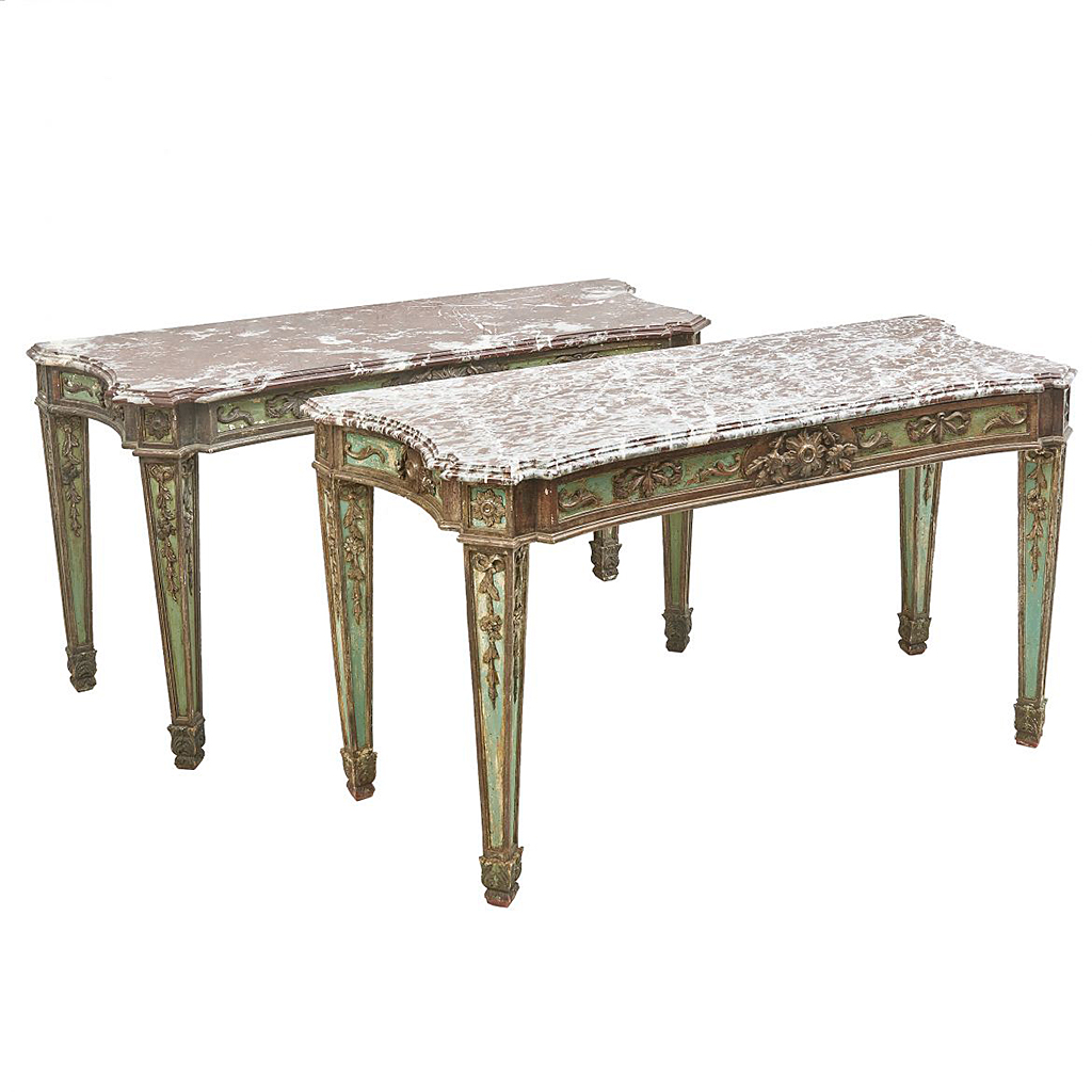 ITALIAN NEOCLASSICAL CONSOLE TABLE CARVED AND SILVER GILDED ON A PALE TORQUOISE / GREEN GROUND WITH SHAPED AND MOULDED BROWN RANCE MARBLE TOP CIRCA 1780 86 CM HIGH 163 CM WIDE 68 CM DEEP (X2)