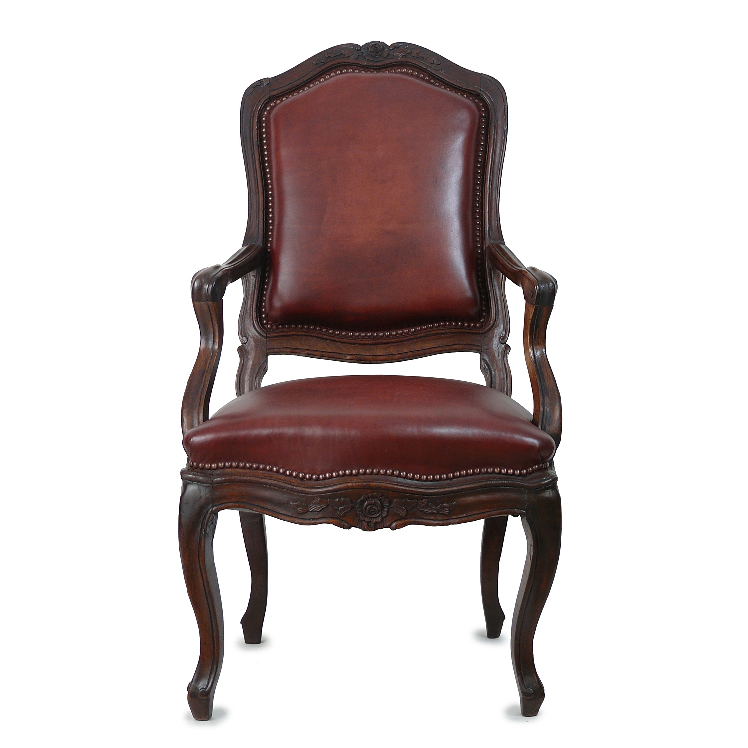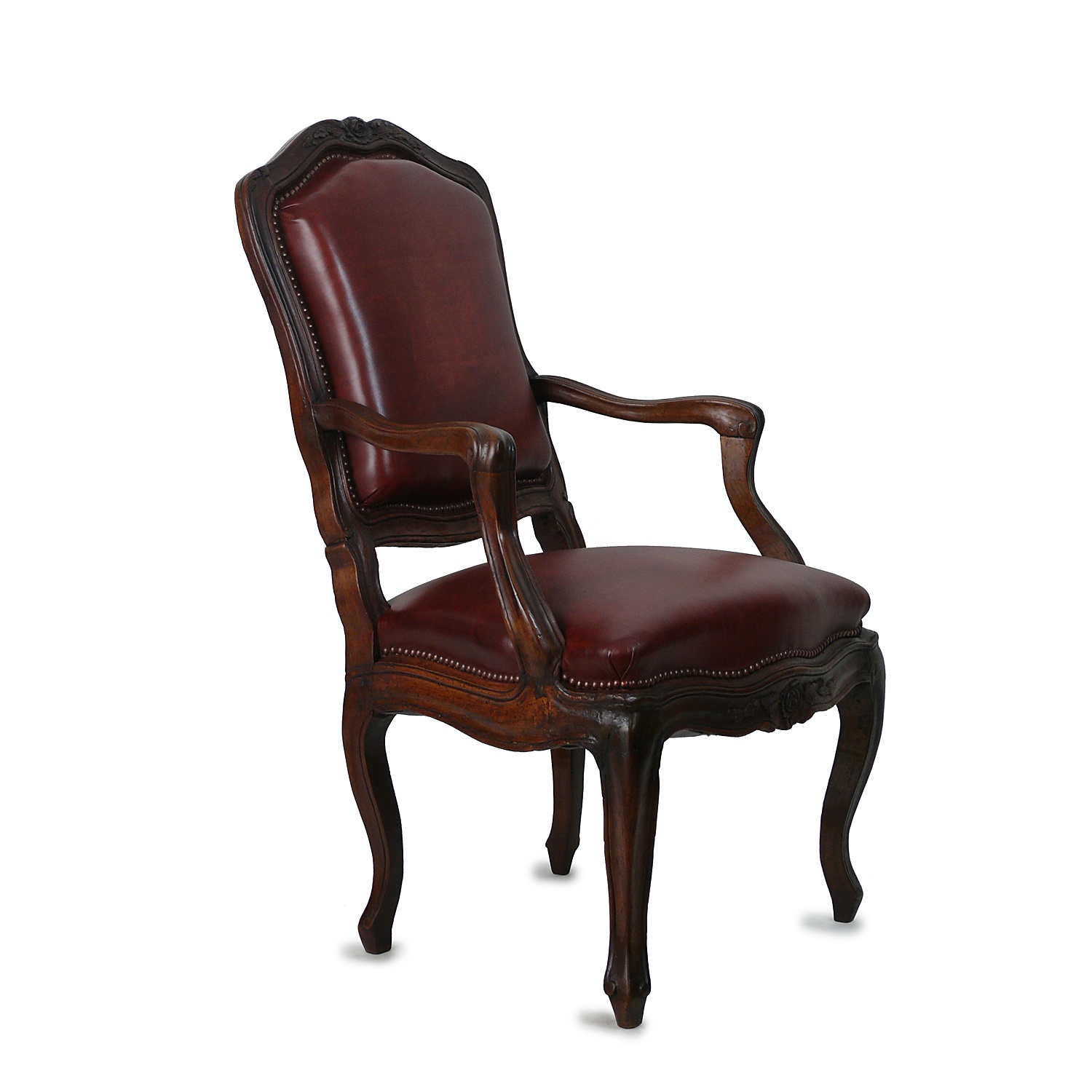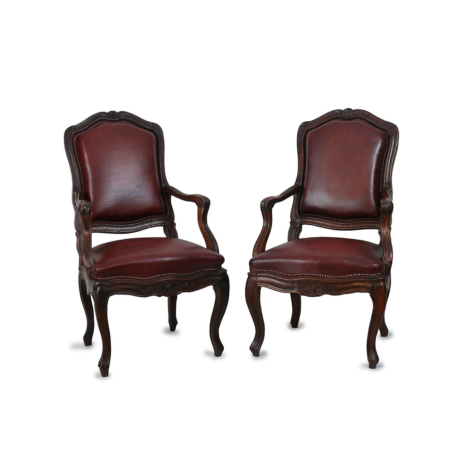 ITALIAN OPEN ARM CHAIR CARVED WALNUT BURGUNDY LEATHER UPHOLSTERY 18TH CENT 102 CM HIGH 62 CM WIDE 67 CM DEEP (X2)