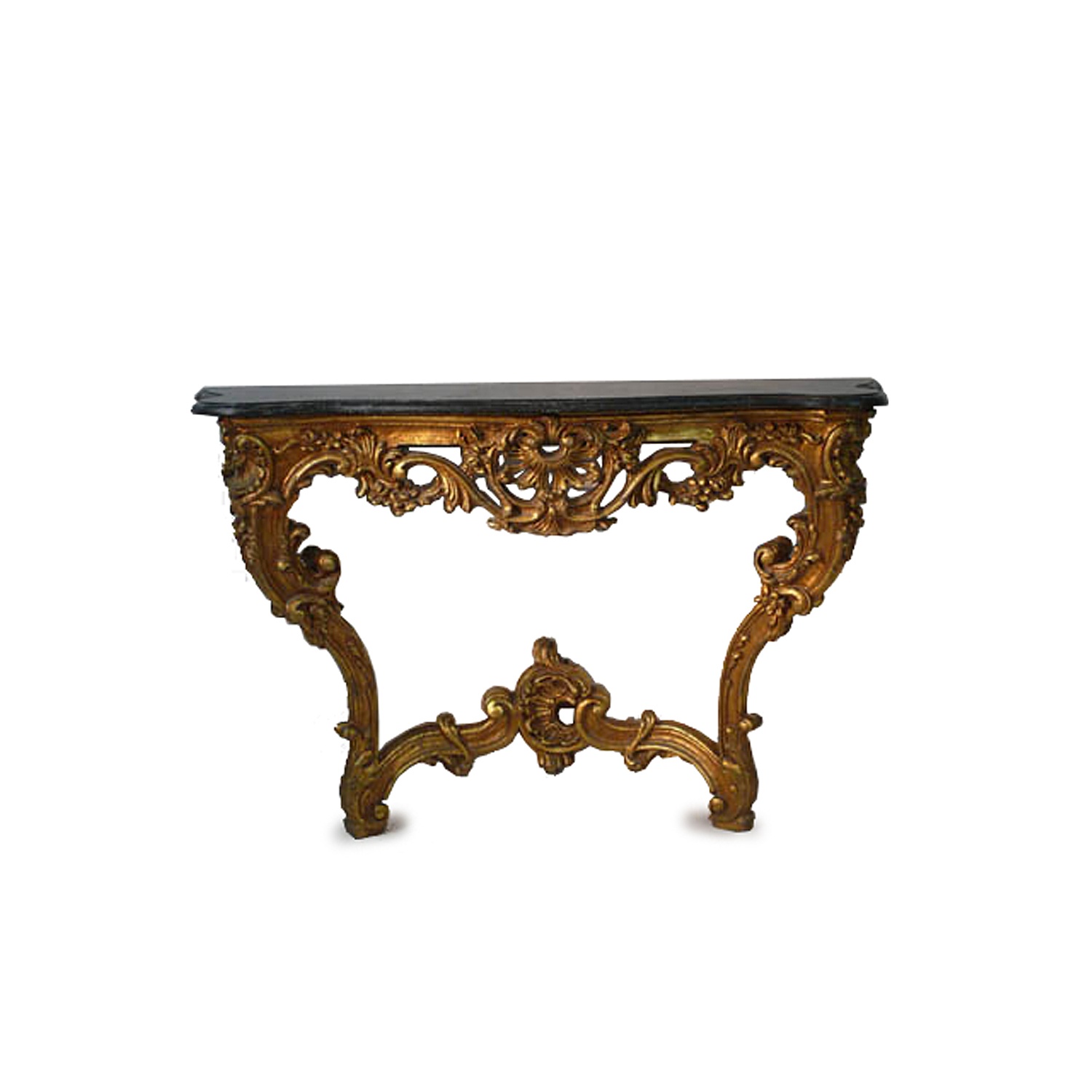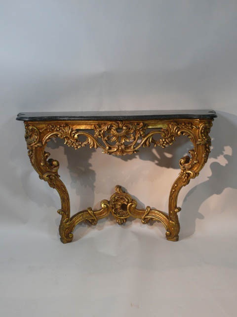 ITALIAN ORNATE GILT WOOD SERPENTINE CONSOLE TABLE FAUX MARBLE TOP 3'8/i / 77 CM HIGH X 113 CM WIDE X 35 CM DEEP (X2)