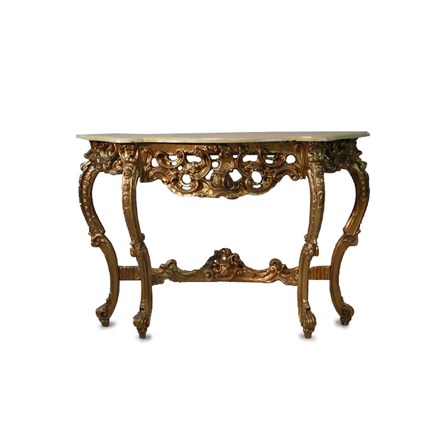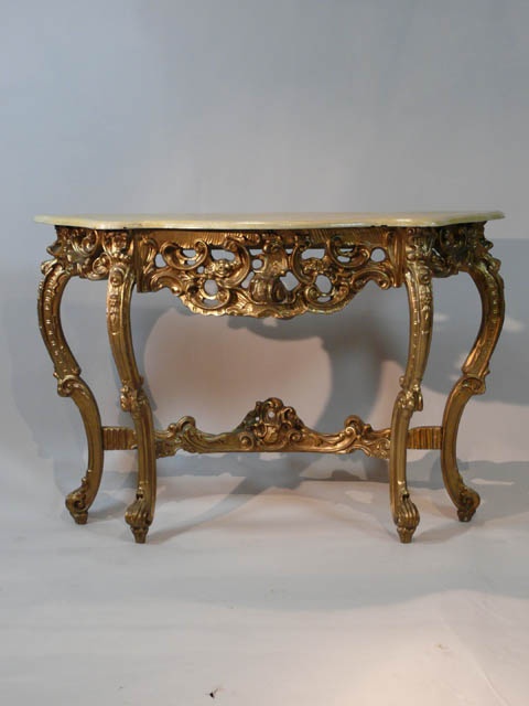 ITALIAN ORNATE GILT WOOD SERPENTINE CONSOLE TABLE PAINTED TOP 87 CM HIGH X 129 CM WIDE X 40 CM DEEP (X2)