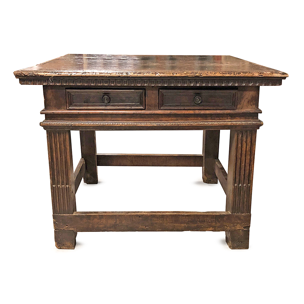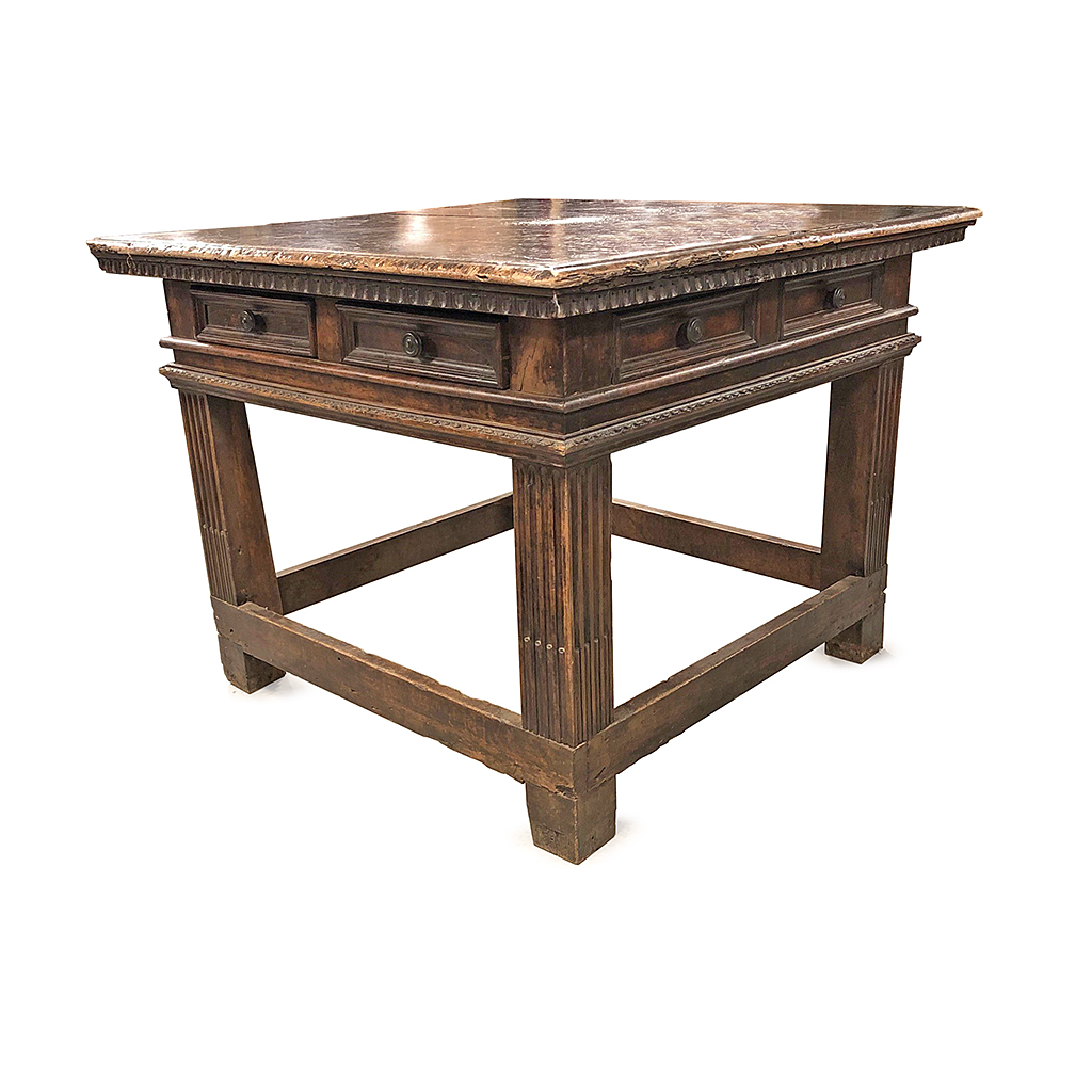 ITALIAN / TUSCAN LARGE CARVED DARK WALNUT SQUARE CENTRE TABLE WITH FLUTED LEGS AND TWO DRAWERS EACH SIDE 17TH CENT. 112 CM LONG 112 CM WIDE 86 CM HIGH