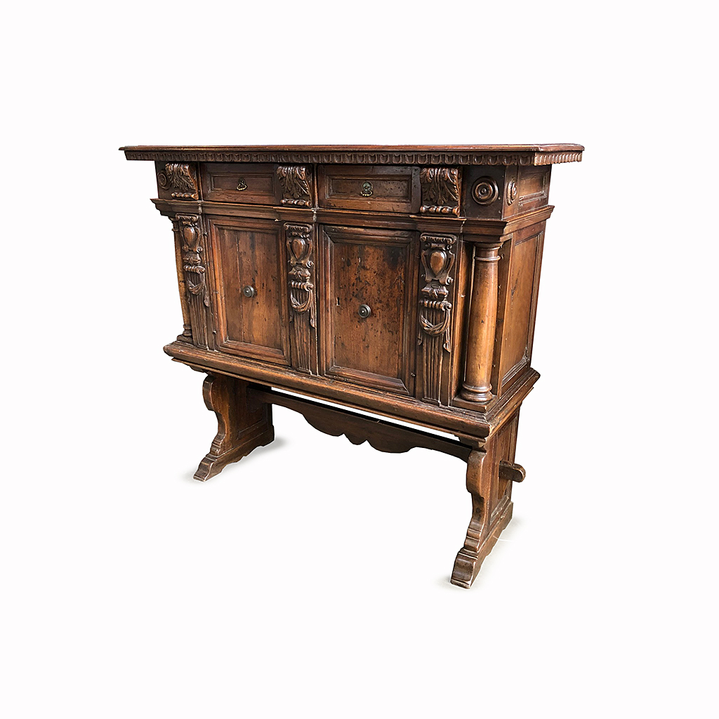 ITALIAN WALNUT CUPBOARD ON STAND WITH DRAWERS TO FRIEZE 18TH CENT 128 CM HIGH 140 CM WIDE 49 CM DEEP