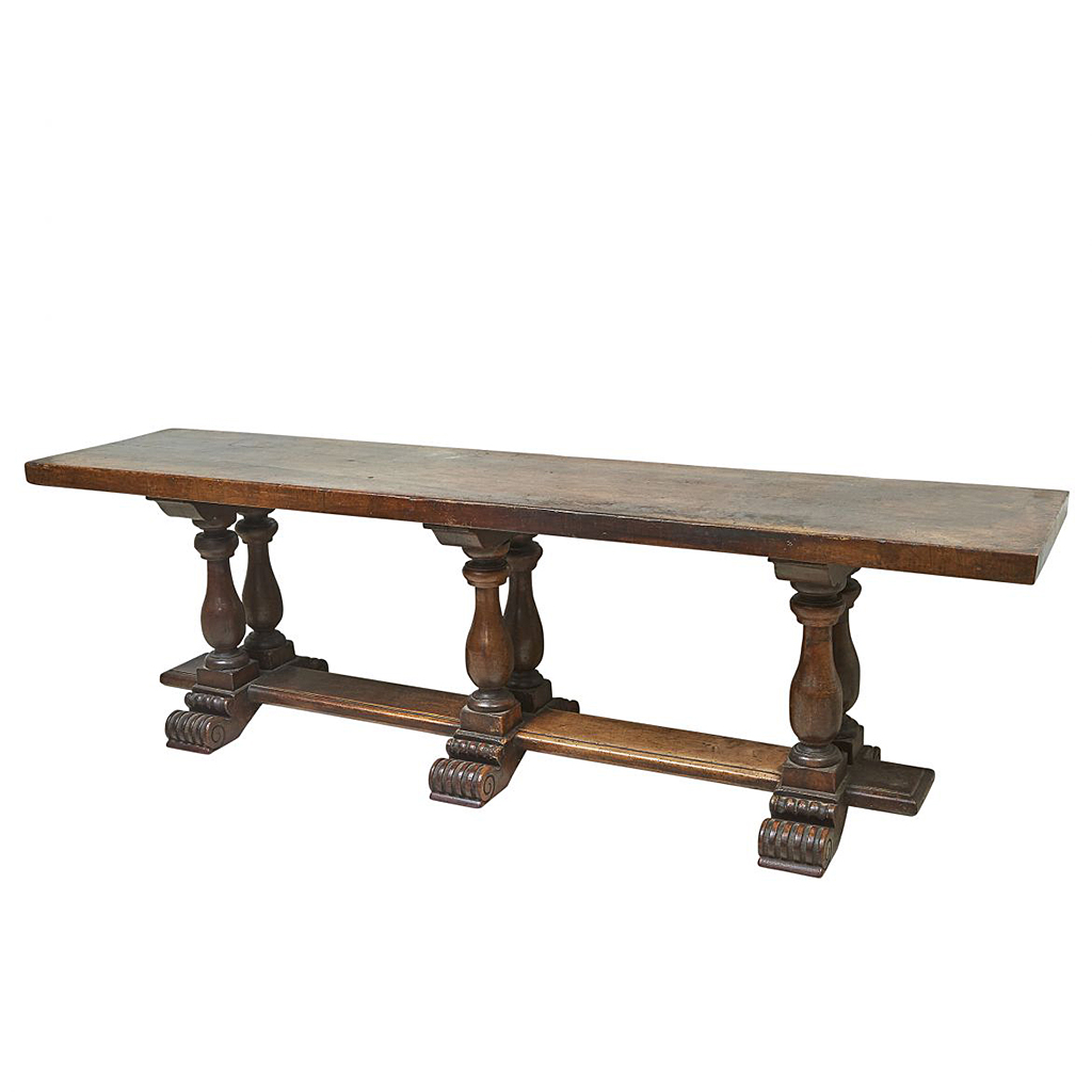 ITALIAN WALNUT REFECTORY TABLE WITH SINGLE PLANK TOP ON SIX TURNED BALUSTER COLUMN BASE 18TH CENT 79 CM HIGH 267 CM LONG 62 CM WIDE