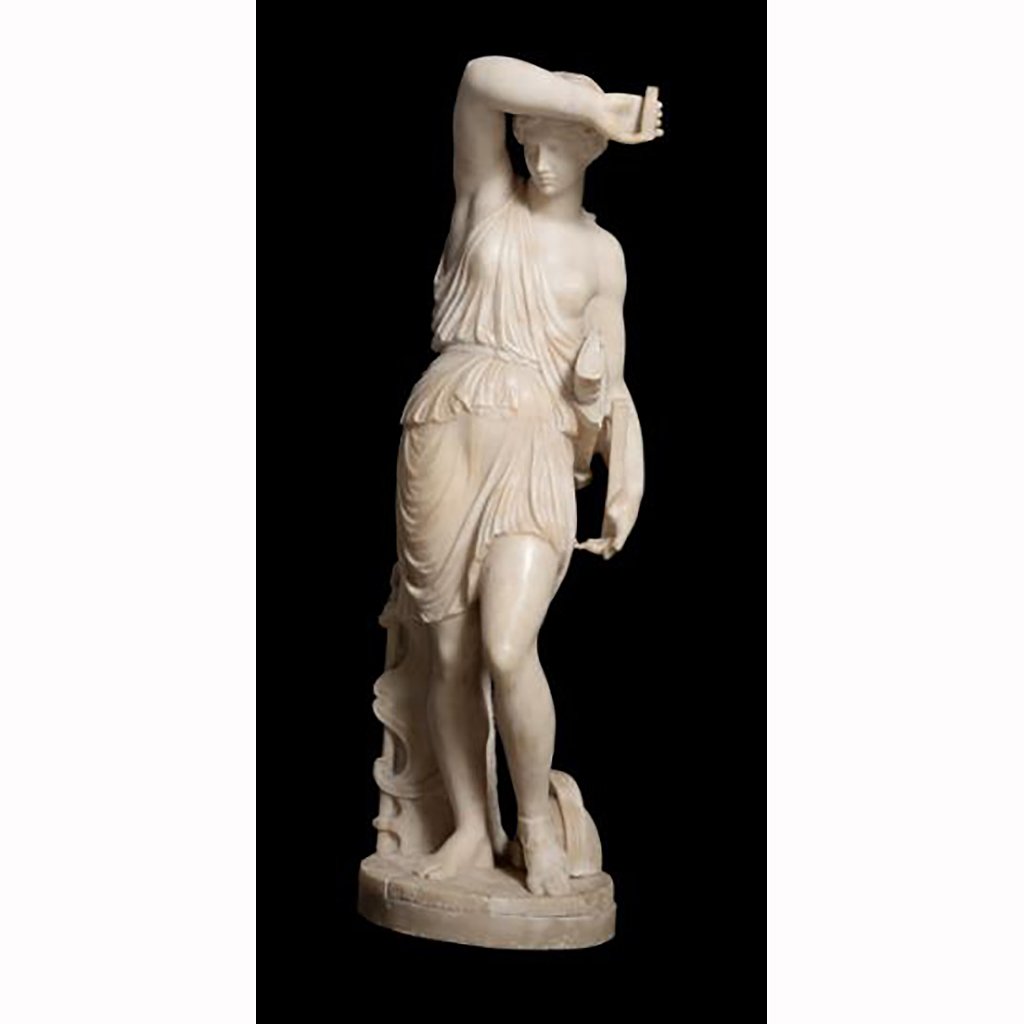 ITALIAN WHITE ALABASTER MARBLE STATUE OF A WOUNDED AMAZON AFTER THE ANTIQUE 5TH CENT ORIGINAL WEARING A SHORT TUNIC AND A QUIVER AT HER SIDE 19TH CENT 73 CM HIGH