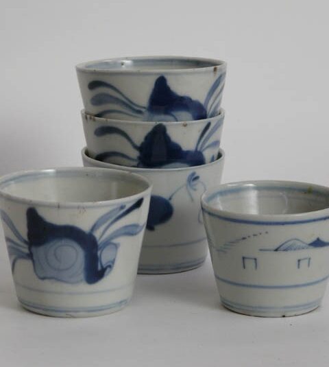 JAPANESE ANTIQUE BLUE AND WHITE BEAKER CUP 7 CM DIAM. (X6)
