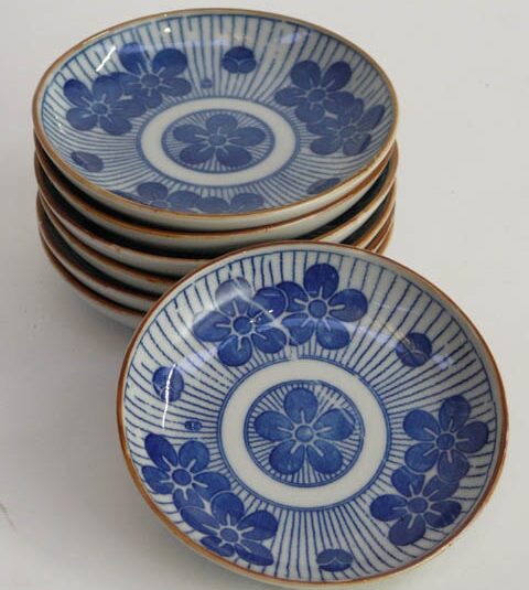 JAPANESE BLUE AND WHITE CHINA SAUCER 13 CM DIAM. (X7)