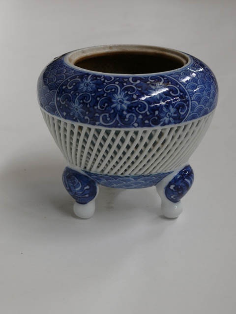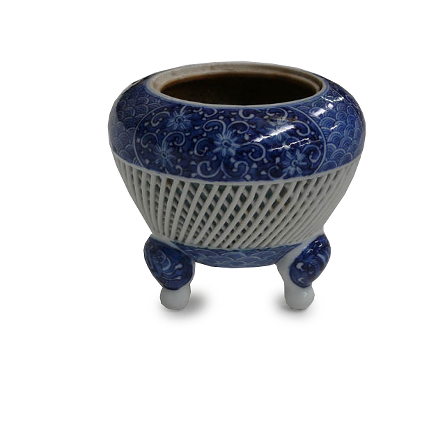 JAPANESE BLUE AND WHITE SMALL VASE WITH THREE LEGS 9 CM HIGH