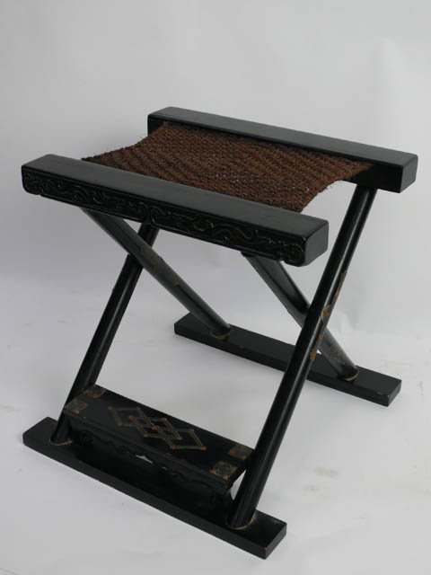 JAPANESE CARVED BLACK LACQUER STOOL WITH FOLDING RUSH SEAT 51 CM HIGH (X2)