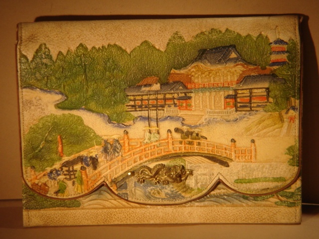 JAPANESE DECORATED CREAM LEATHER CLUTCH HANDBAG WITH GILT METAL CLASP 20 CM WIDE