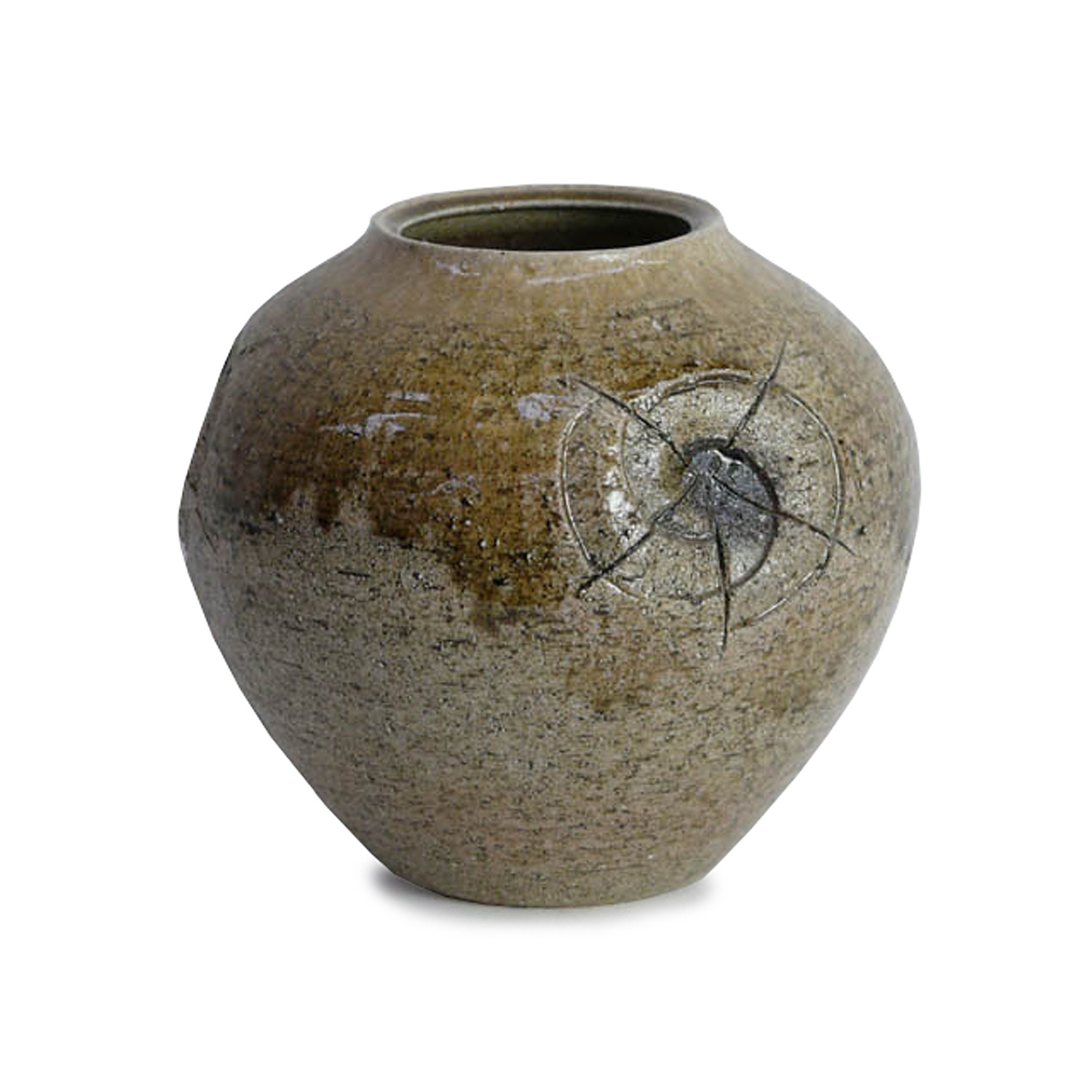 JAPANESE OATMEAL GLAZED VASE WITH STYLISED SHELL MOTIF 22 CM HIGH