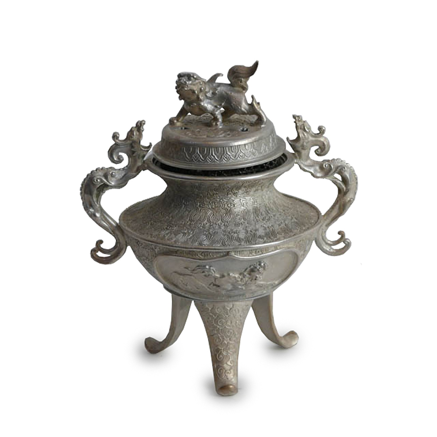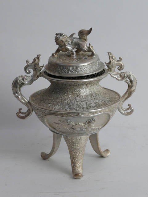 JAPANESE SILVER METAL INCENSE BURNER WITH KYLON DOG LID 23 CM HIGH