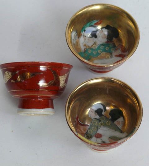 JAPANESE TINY RED SAKE CUP WITH GOLD INTERIOR 5 CM DIAM. (X2)