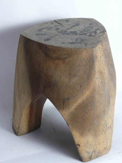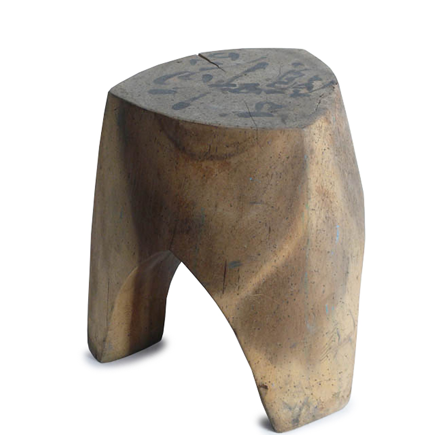JAPANESE TREE TRUNK STOOL THREE LEGGED WITH CALIGRAPHY TO SEAT 45 CM HIGH