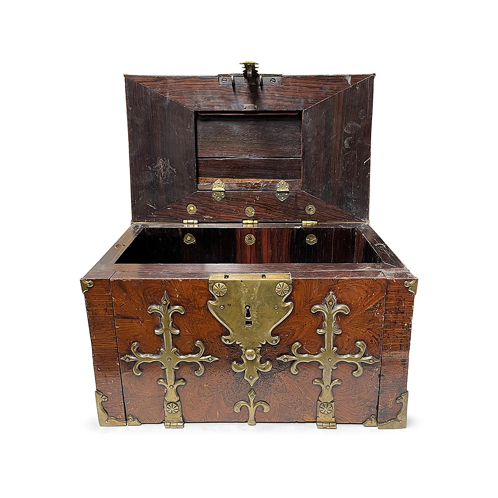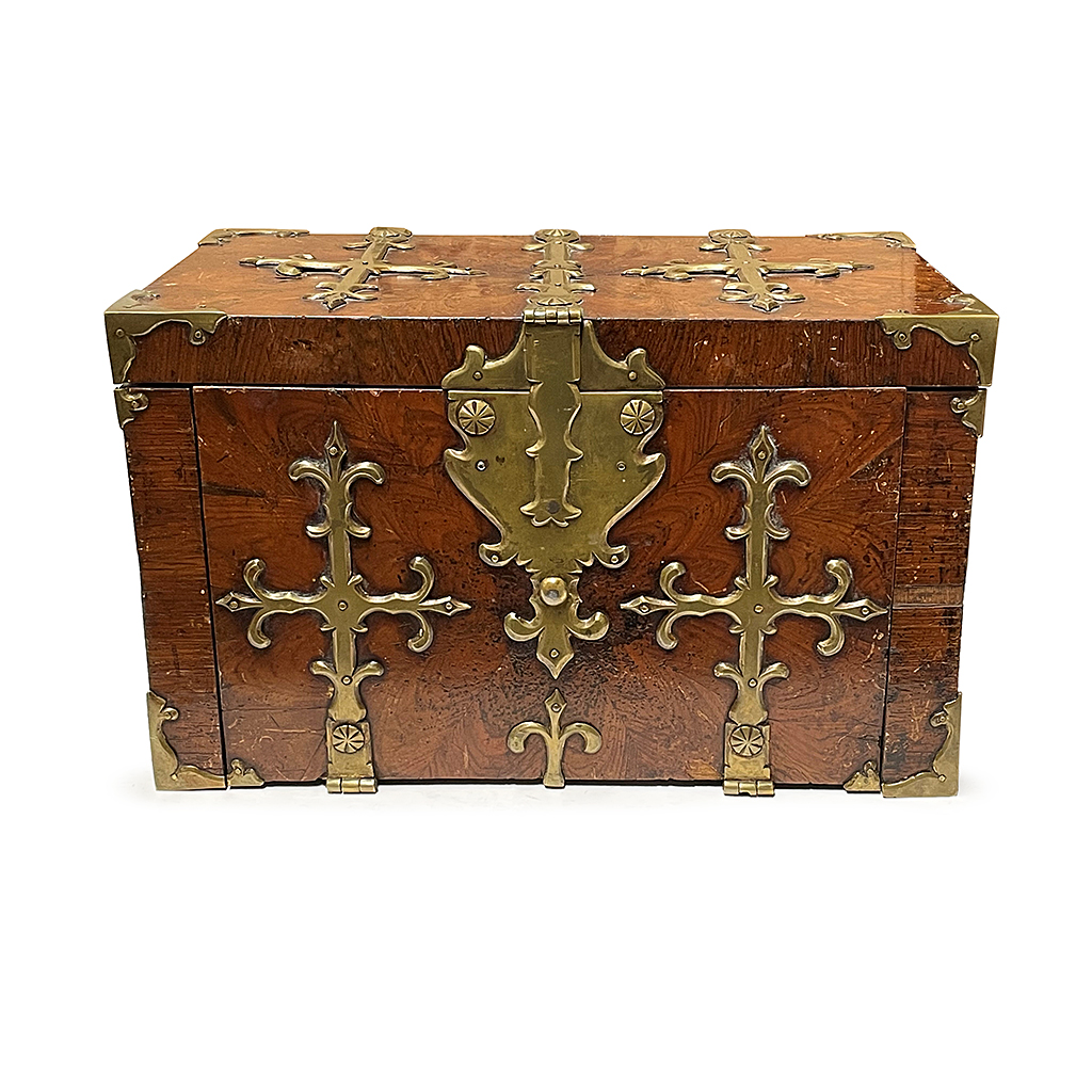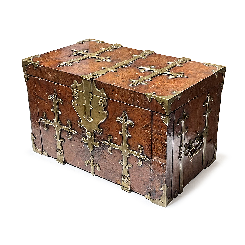 17TH CENTURY DUTCH BRASS BOUND WALNUT STRONGBOX / COFFRE FORT 24 CM HIGH 39 CM WIDE 23.5 CM DEEP