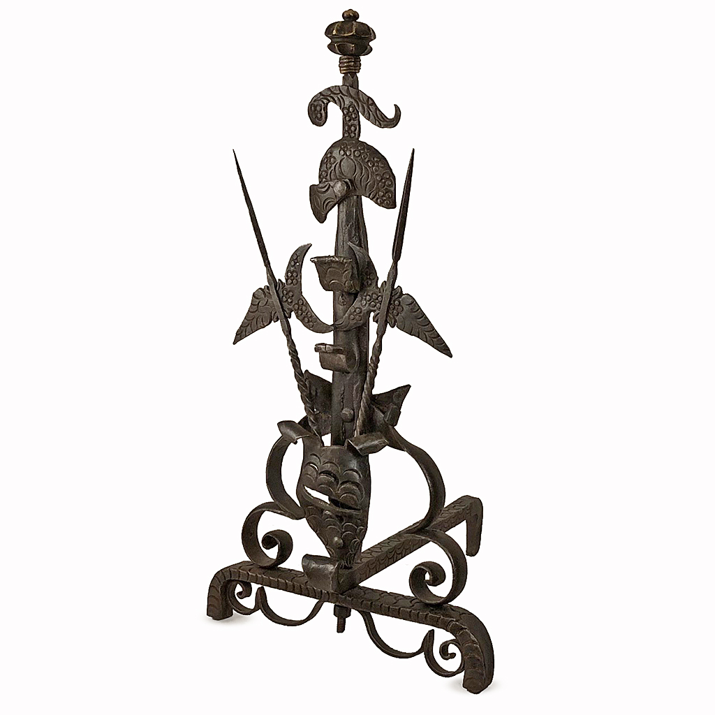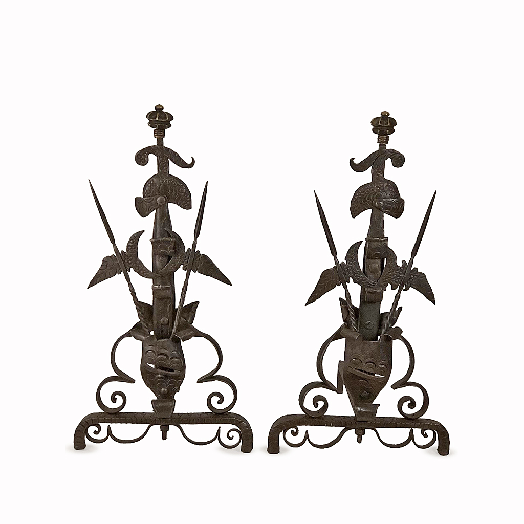 LARGE ARMORIAL WROUGHT IRON FIRE DOG 103 CM HIGH 53 CM WIDE 59 CM DEEP (X2)