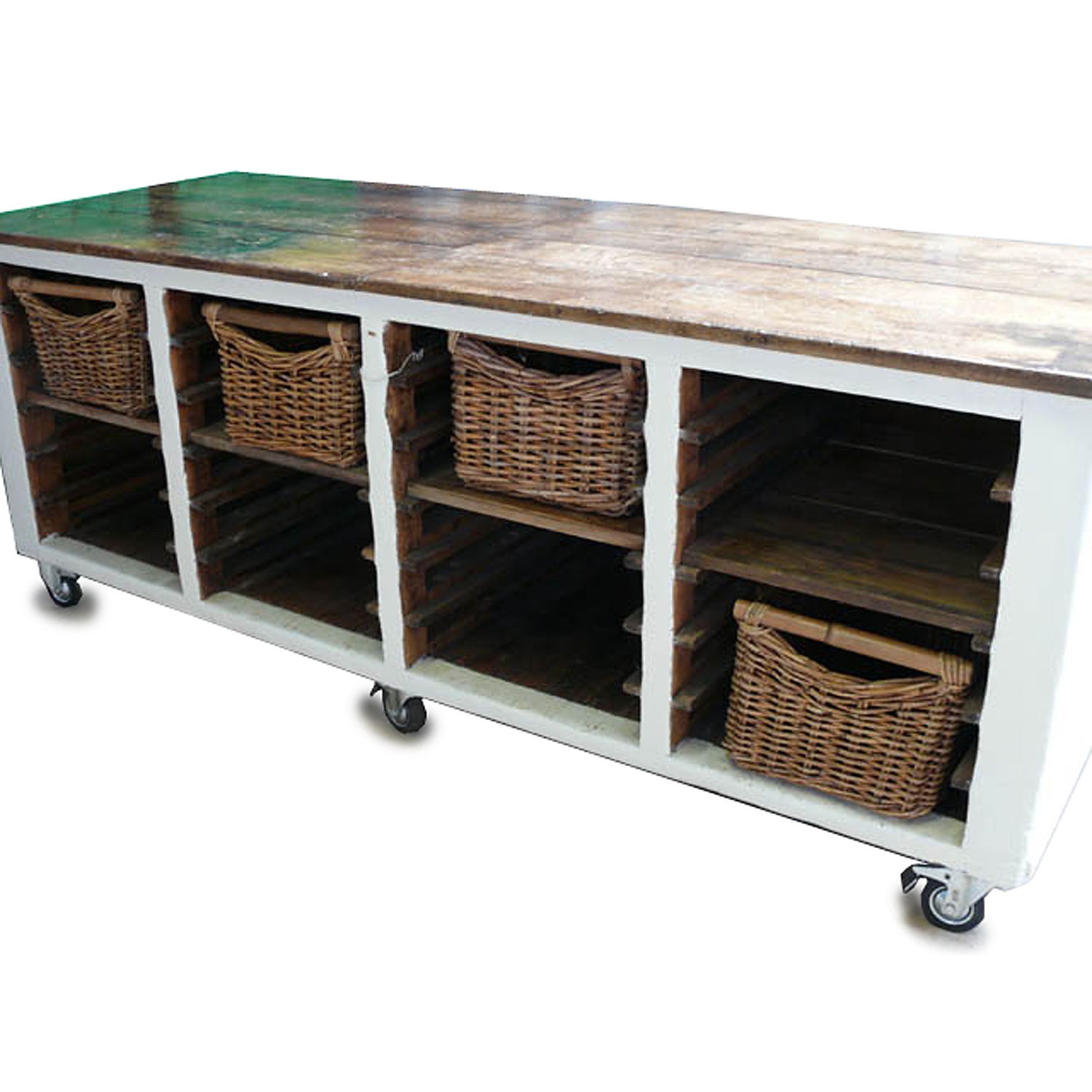 LARGE BAKERS PREPARATION BENCH CREAM PAINTED WITH FOUR BASKET DRAWERS ON CASTORS 230 CM LONG 84 CM WIDE 88 CM HIGH