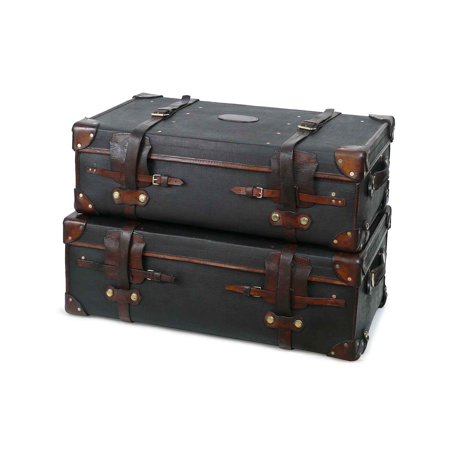 LARGE BLACK CANVAS TRUNK WITH TAN LEATHER TRIM AND STRAPS 88 CM - 92 CM WIDE
