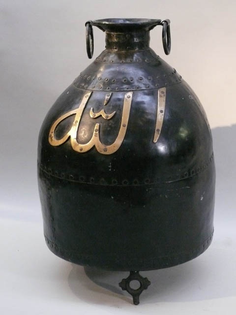 LARGE BLACK IRON INDIAN VASE / URN WITH BRASS ISLAMIC SCRIPT PLUS RING HANDLES ON THREE SHORT LEGS 26/i HIGH (X2)