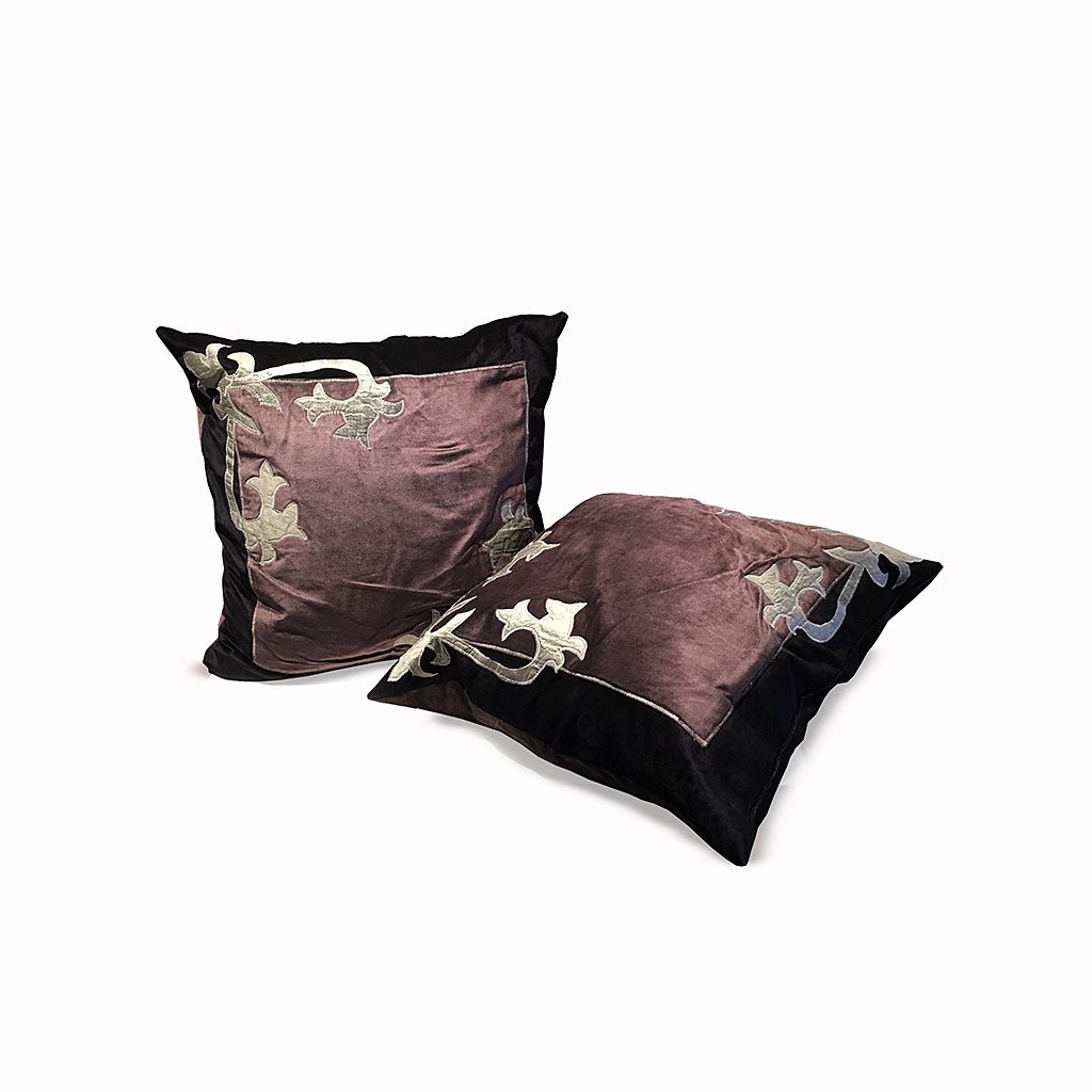 LARGE BLACK VELVET CUSHION WITH GREY CENTRAL PANEL AND APPLIQUE
