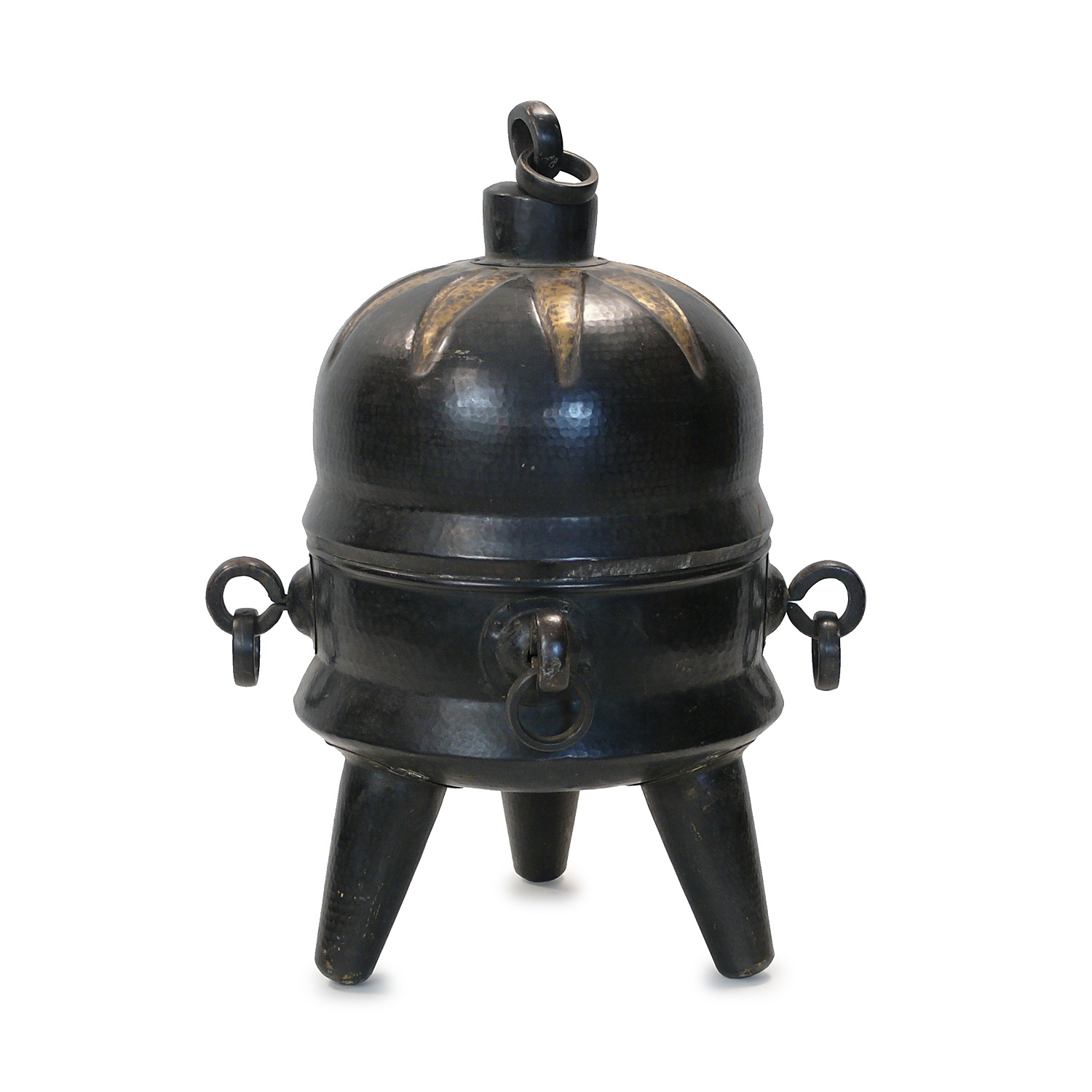 LARGE BRONZE ORIENTAL JARDINIERE / INCENSE BURNER STAR PATTERN DOMED LID ON THREE LEG BASE 81 CM HIGH 58 CM WIDE (X2)