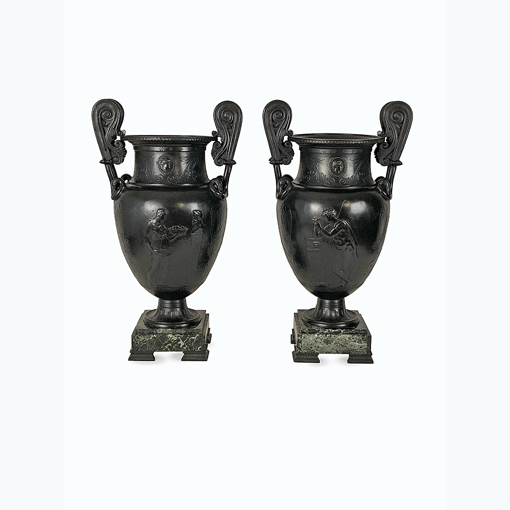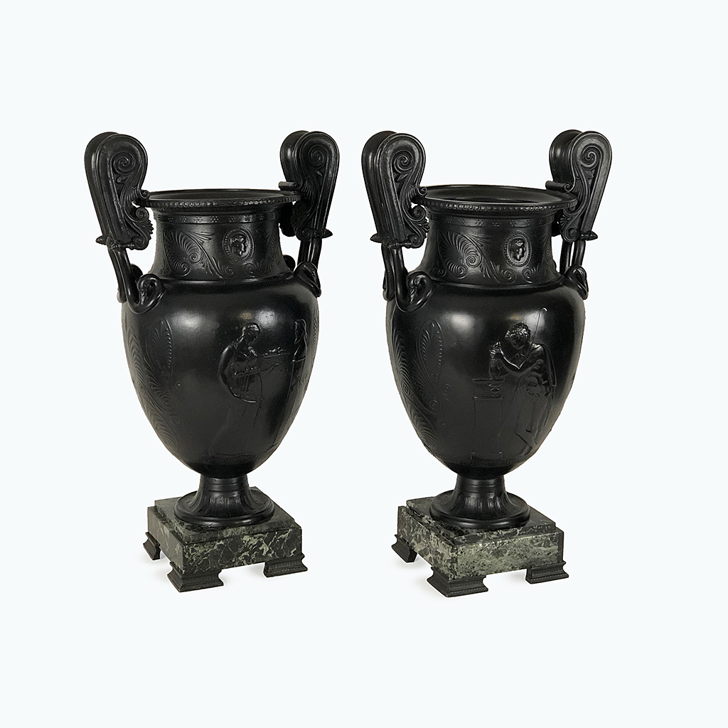 LARGE BRONZE URN / VASE CLASSICAL GREEK STYLE ON VERDI ANTICO MARBLE BASE FRENCH 19TH CENT. 53 CM HIGH 30 CM WIDE 24 CM DEEP (X2)