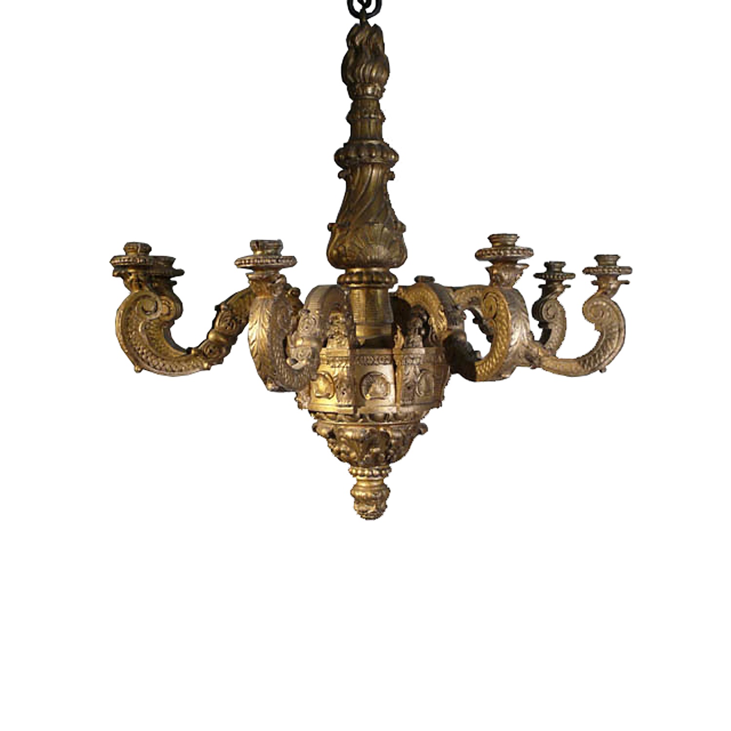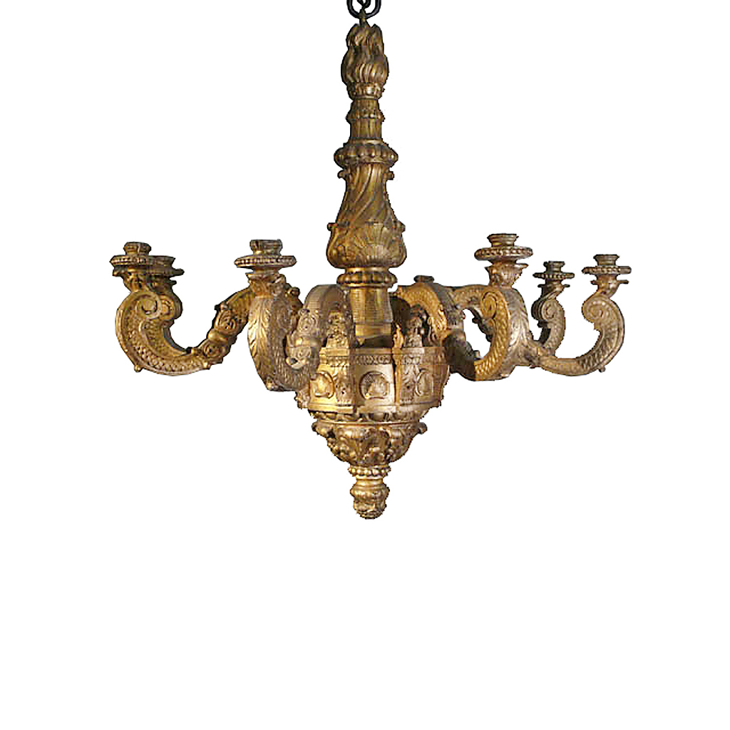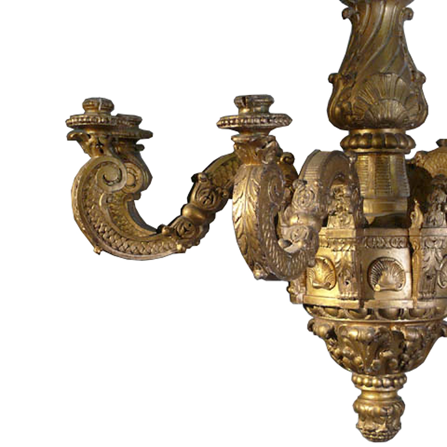 LARGE CARVED AND GILDED EIGHT LIGHT CHANDELIER SHELL DECORATION 17TH CENT. STYLE 2'8/i WIDE 3'1/i HIGH 14 KG