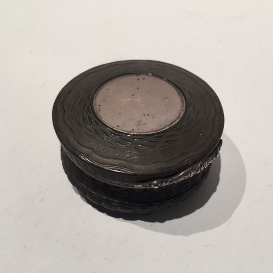 LARGE CARVED TORTOISESHELL SNUFF BOX WITH SILVER CENTRAL MEDALLION AND CLASP