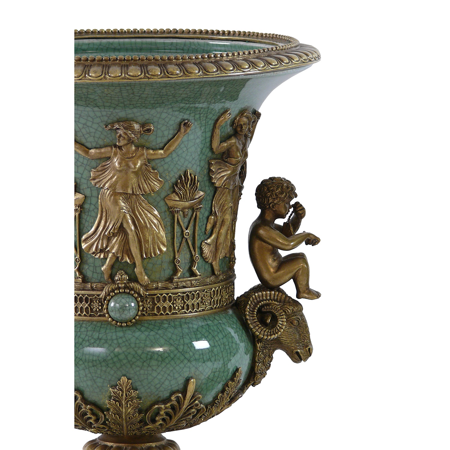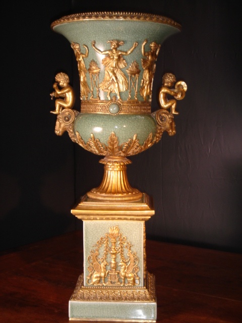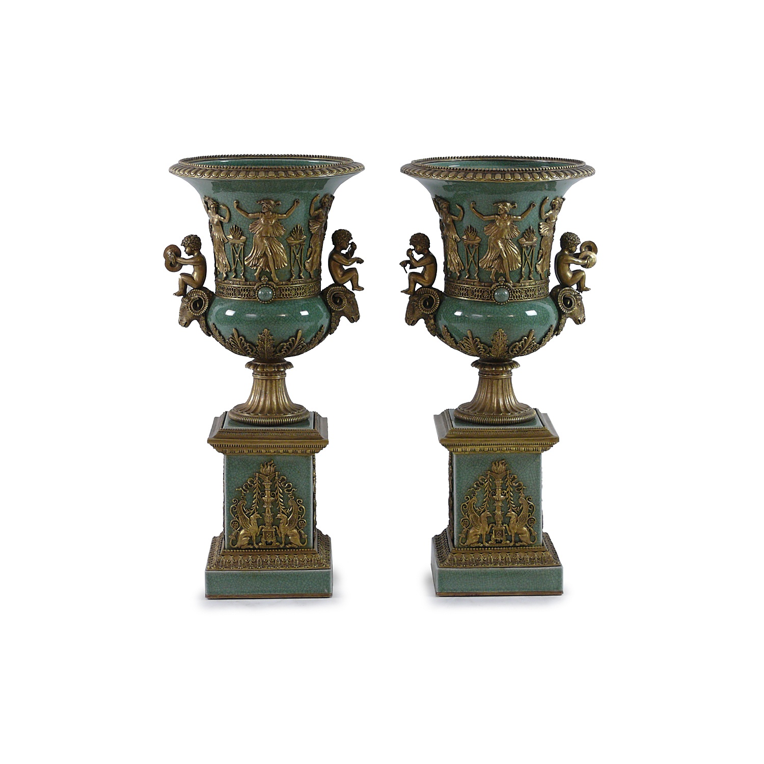 LARGE CELADON GREEN CRACKLE GLAZE CHINA CLASSICAL URN WITH ORMOLU RAM AND CHERUB MOUNTS THOMIRE STYLE 29/i HIGH (X2)