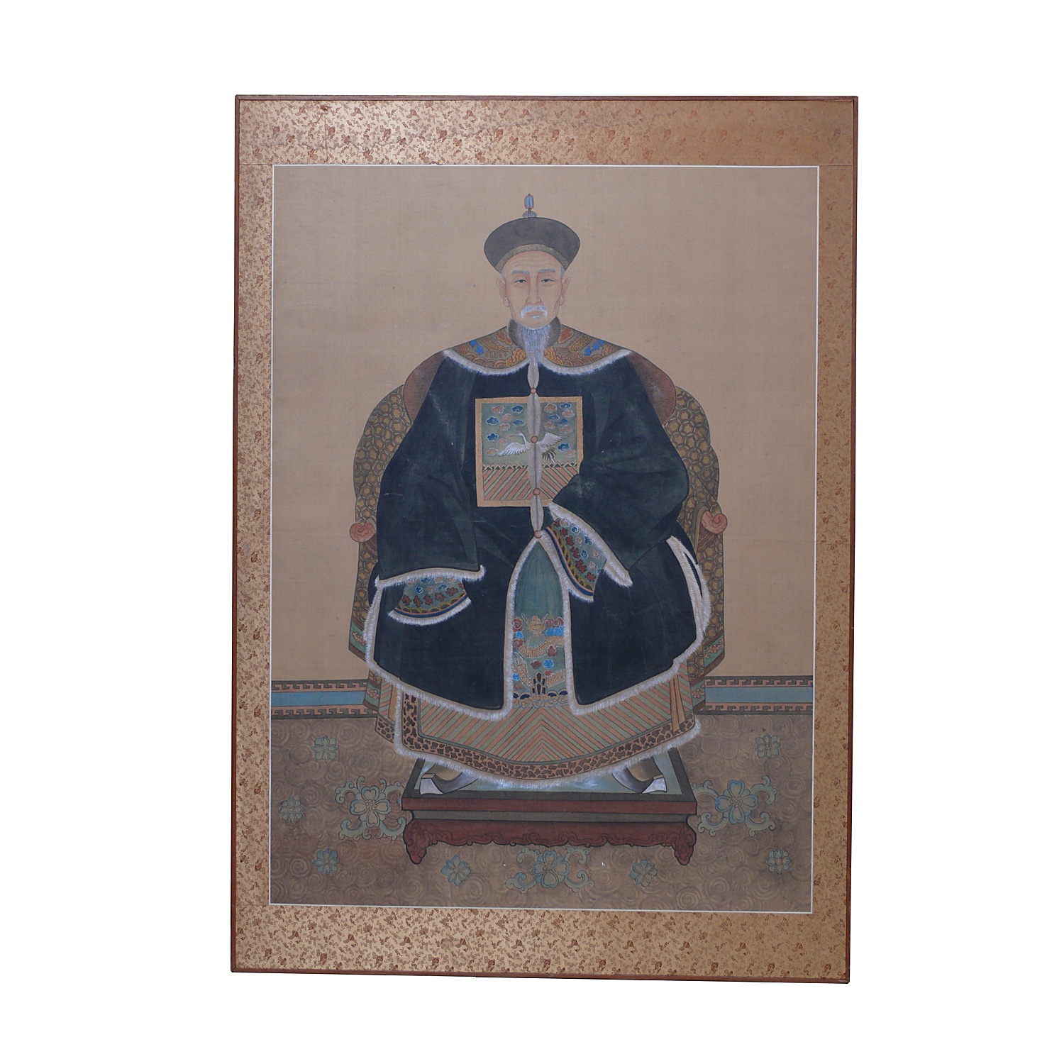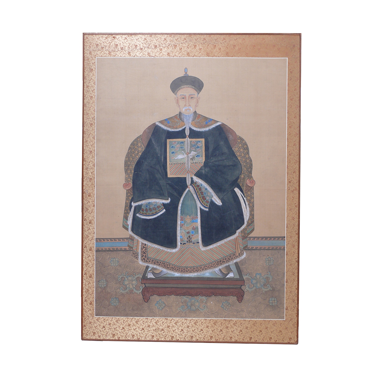 LARGE CHINESE ANCESTRAL PORTRAIT ON SILK WITH AMBER GROUND 139 CM X 98 CM (X2)