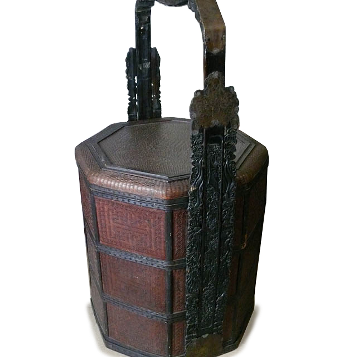 LARGE CHINESE BLACK AND RED CANE TABLE / BOX FORMER PICNIC / FOOD HAMPER 103 CM HIGH 57 CM WIDE 53 CM DEEP