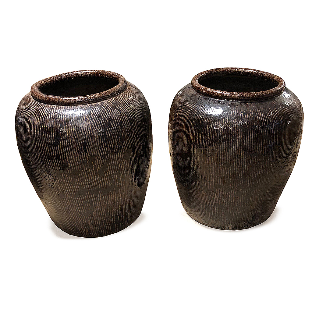 LARGE CHINESE EGG STORAGE VASE BROWN GLAZED WITH INCISED LINE PATTERN TOP 70 CM - 80 CM HIGH (X4)