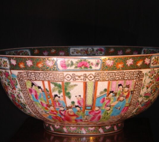 LARGE CHINESE FAMILLE ROSE BOWL WITH GOLD RIM 14/i DIAM. (X2)