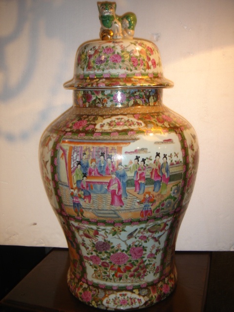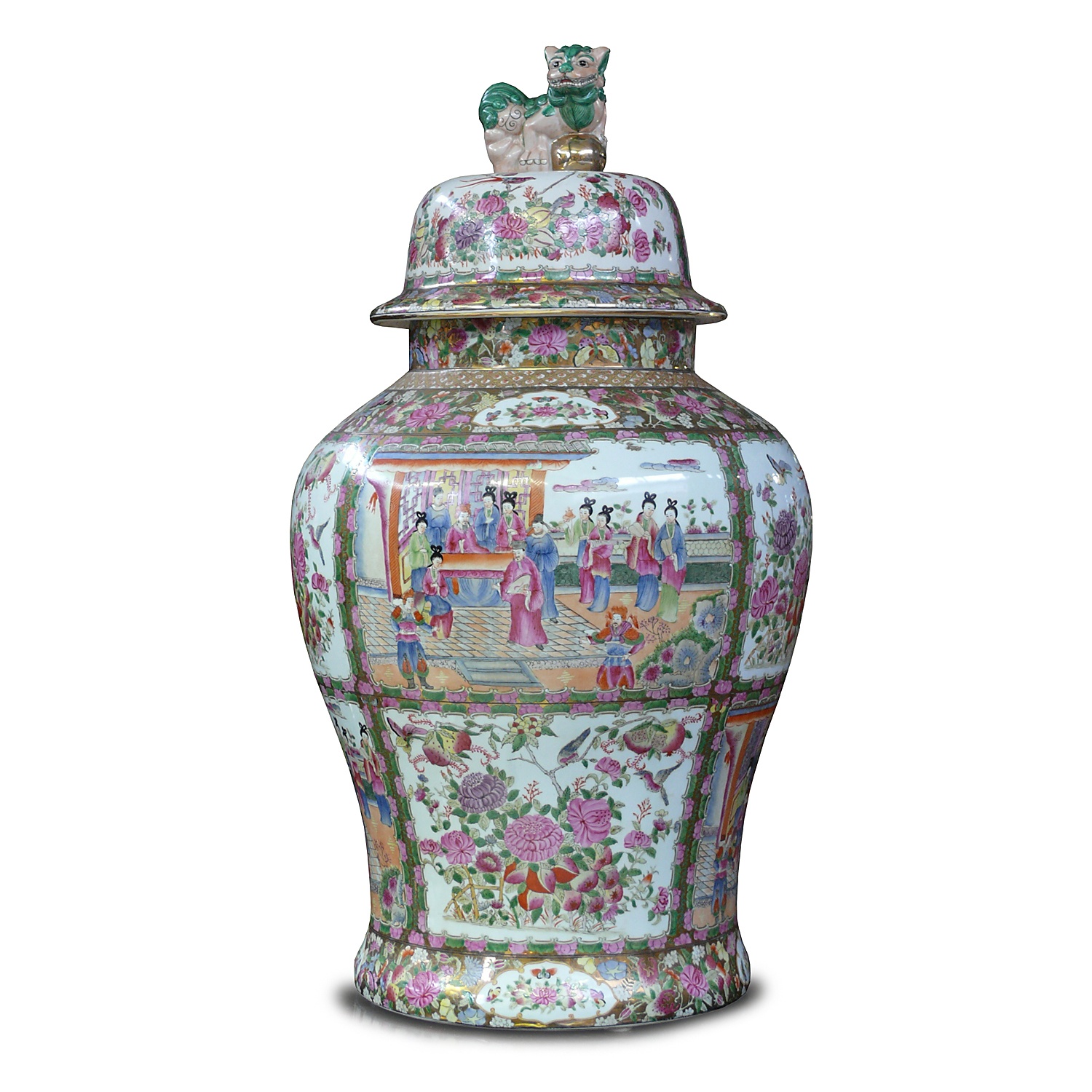 LARGE CHINESE FAMILLE ROSE TEMPLE / SPILL VASE WITH GREEN KYLON DOG LID 33/iH (X2)