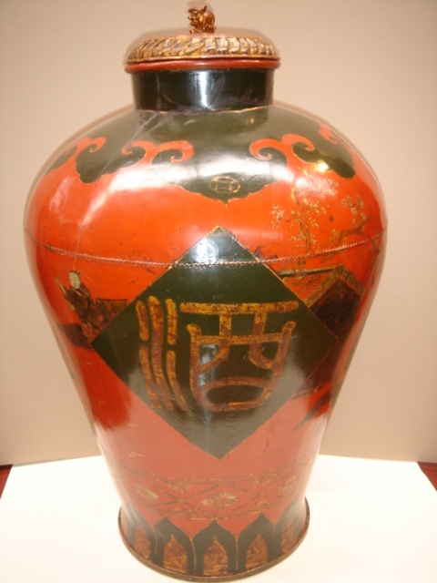 LARGE CHINESE SCARLET AND BLACK LACQUER WINE VASE DECORATED WITH FIGURES AND DIAMOND SHAPE PANEL PLUS LID 24/i HIGH (X2)