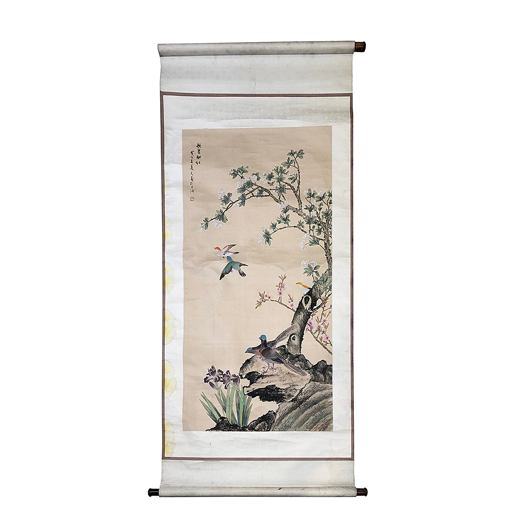 LARGE CHINESE SCROLL WATERCOLOUR PAINTING ON SILK 181 CM HIGH 90 CM WIDE